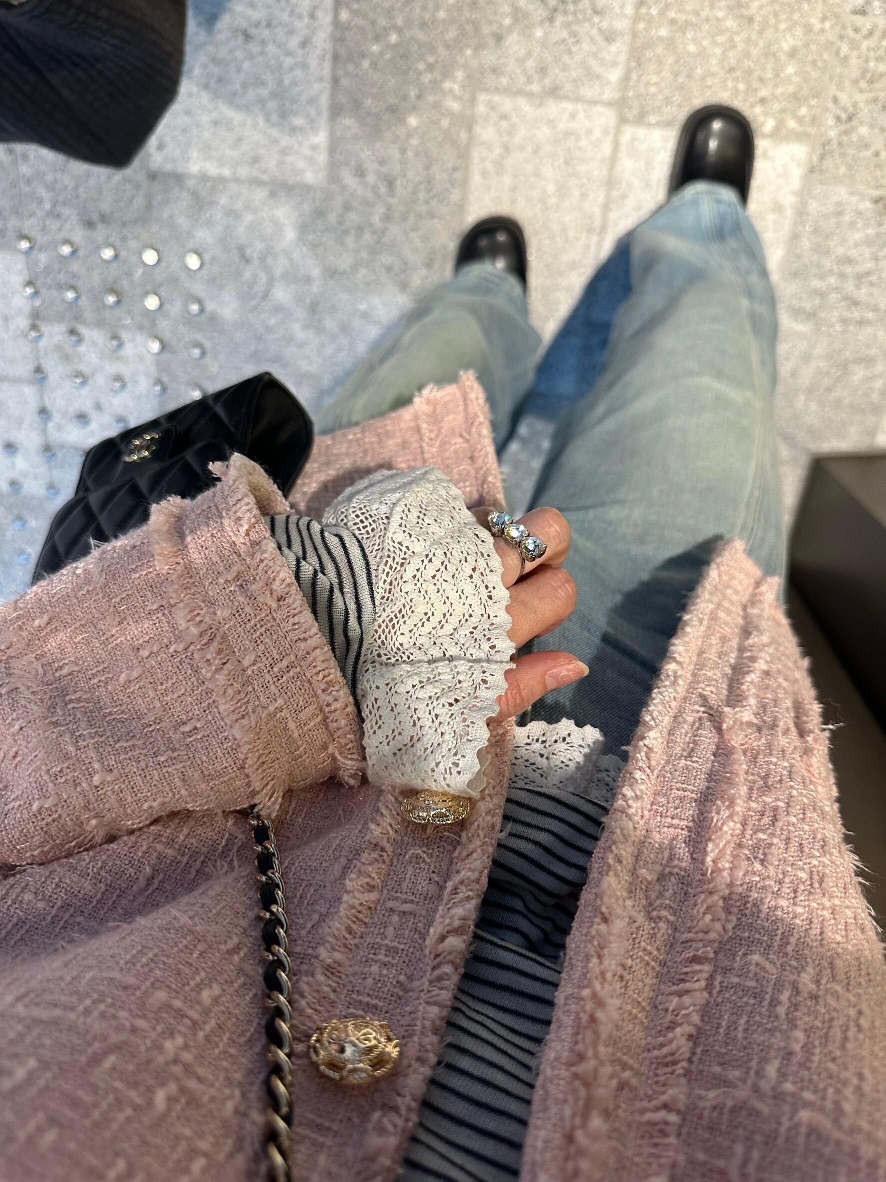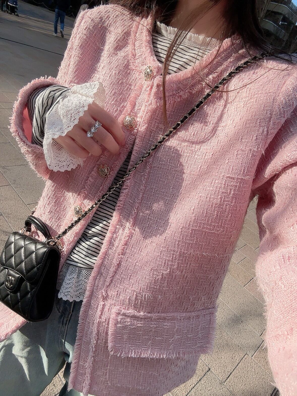 春にぴったりの華やかなゴールドボタンのツイードジャケット。ミディアム丈のデザインで、デイリーやオケージョンに幅広く対応するクラシックなスタイルが魅力です。 キラッと光る艶感のある糸を混ぜたツイード素材の上質感とフリンジディティールが、コーディネートを格上げし、シンプルなコーデでも存在感を放ちます。 高級感を残しつつ、軽やかに羽織ることができ、袖を通しやすいセミオーバーシルエットなのも嬉しいポイント。 春の暖かな陽気にぴったりのアイテムで、ブラウスやカットソーの上にさっと羽織っていただけます。