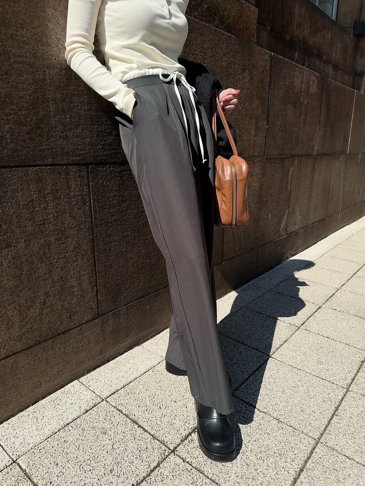 スーツ地の綺麗めなボトムスですがフロントの紐リボンがカジュアルさをプラスしてくれコーデの幅を広げてくれます。