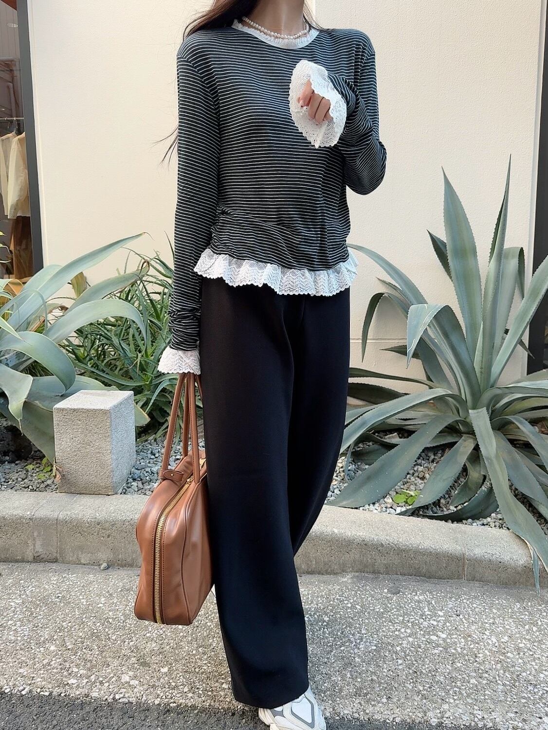 襟、袖、裾に施されたレースが大人可愛い印象を与えるボーダーtee。細見えするピッチのボーダーとレース使いが絶妙にマッチし、カジュアルになりすぎずガーリーなスタイルを演出してくれます。一枚でも、サロペットやベストとレイヤードしても可愛いアイテム。さまざまなボトムスとも相性抜群で、コーディネートの幅が広がります。しっとりとした肌触りの良い素材を使用しているため、長時間の着用でも快適に過ごせるのも魅力です。