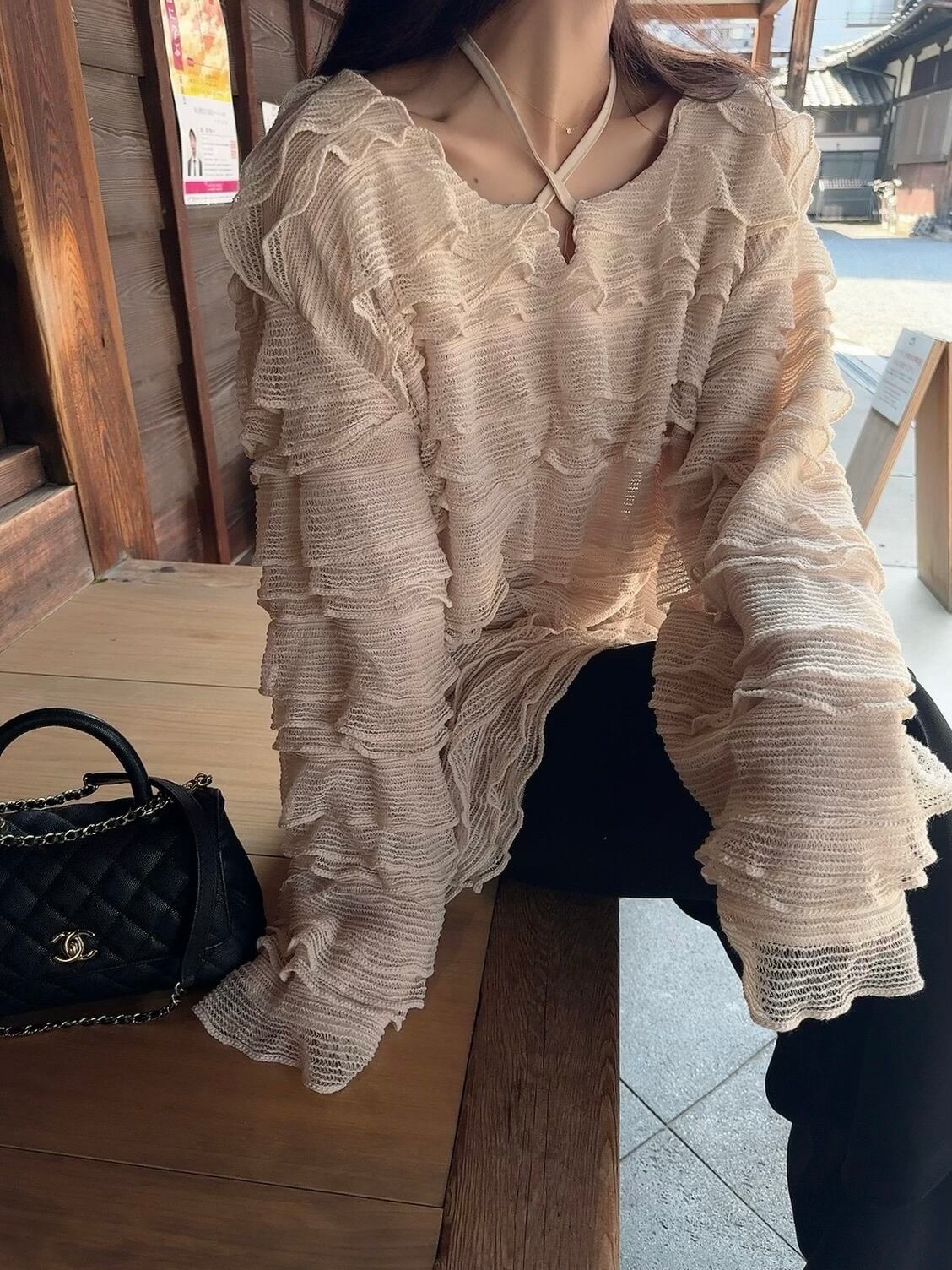ひらひらと揺れ動くデザインと、スプリングニットの素材が春にぴったりの一枚。