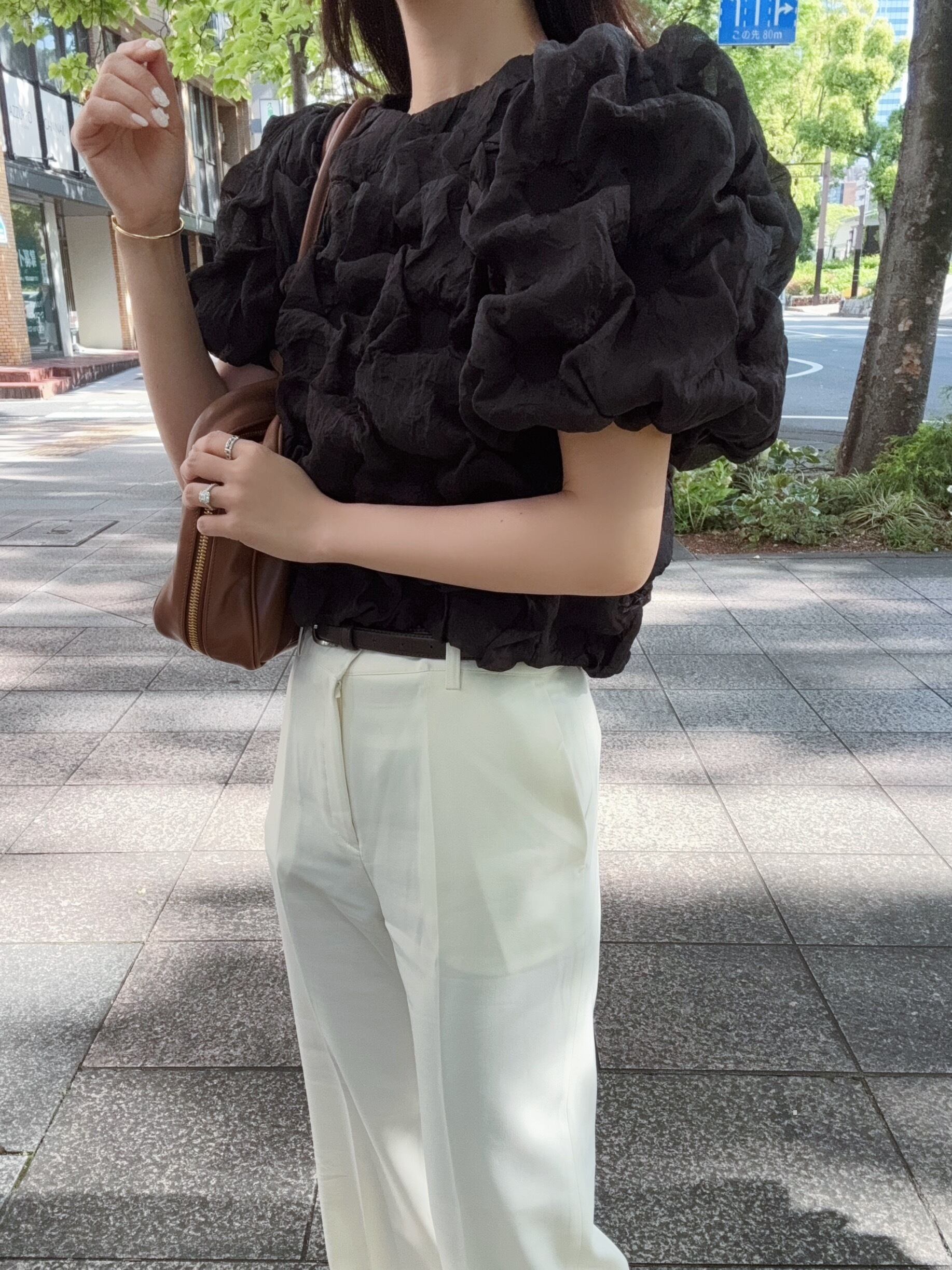 程よい大きさのパフスリーブが顔周りまわりをすっきりと抜け感のある大人っぽい上品な印象に。