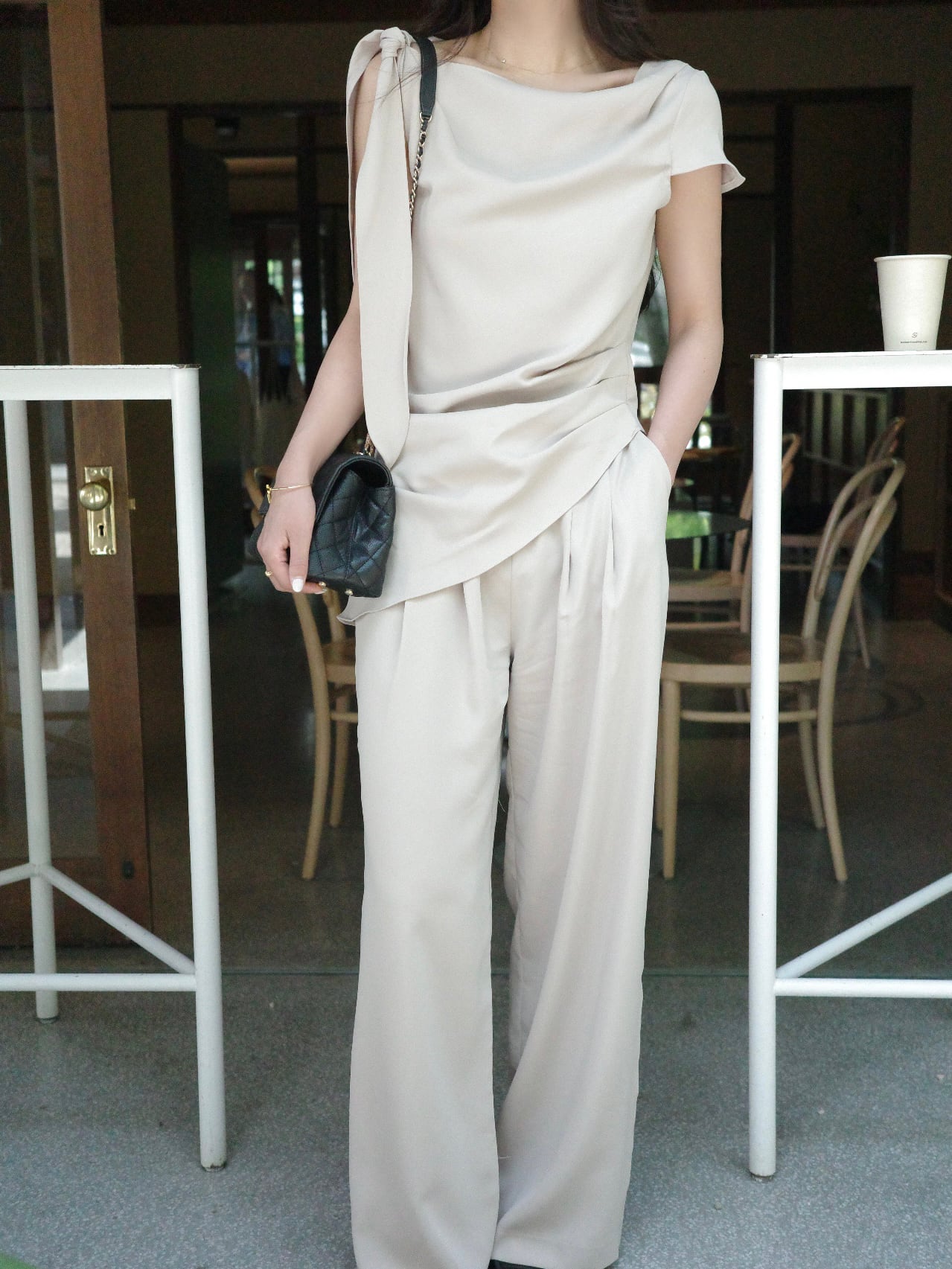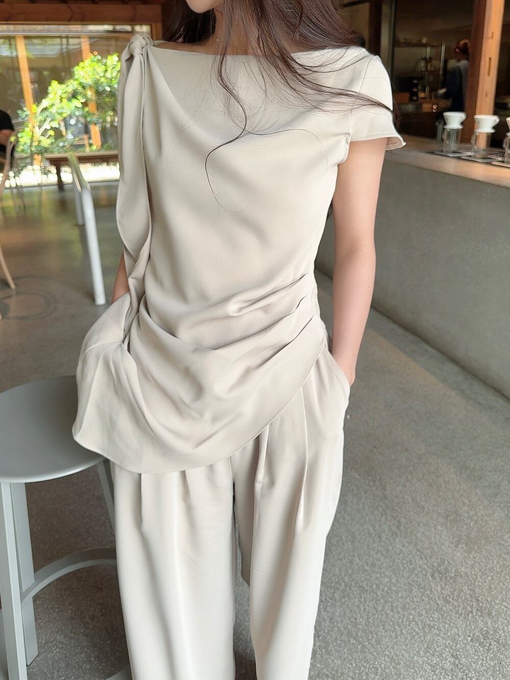 アシンメトリーデザインが目を惹くモードなトップス。美しいフロントのドレープが、品のある抜け感をプラスしウエスト位置を高く見せ、スタイルアップして着ていただけます。