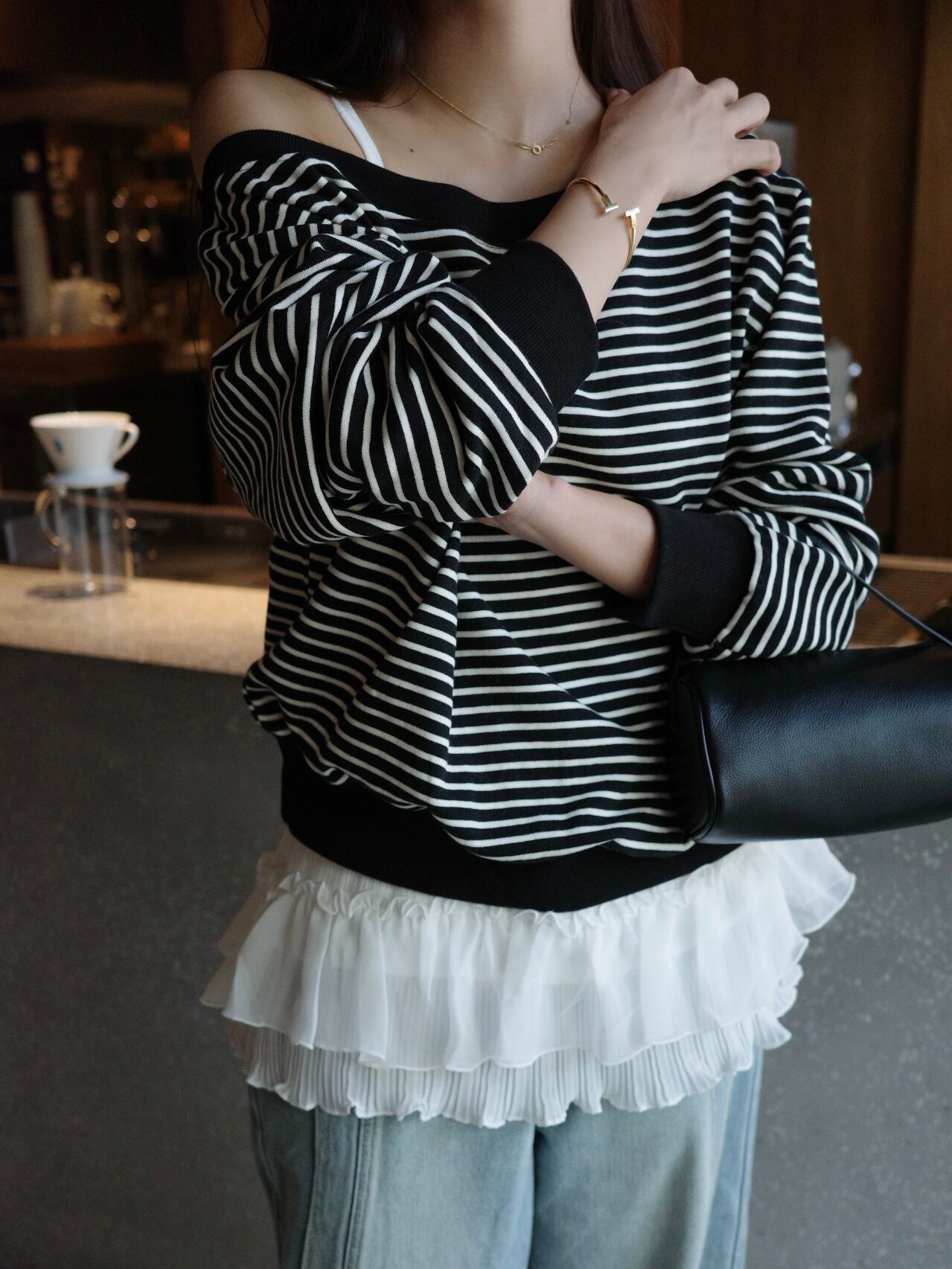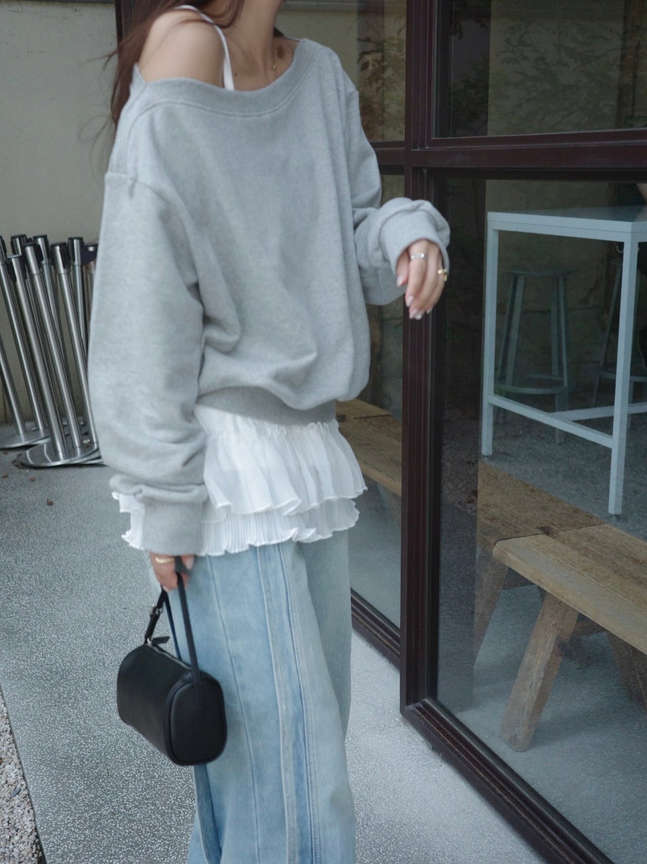 裾にあしらった繊細な二層の表情の違うシフォンフリルが、スウェットやニットの下からチラリとのぞき、シンプルなスタイリングに今年らしいニュアンスを加えてくれます。