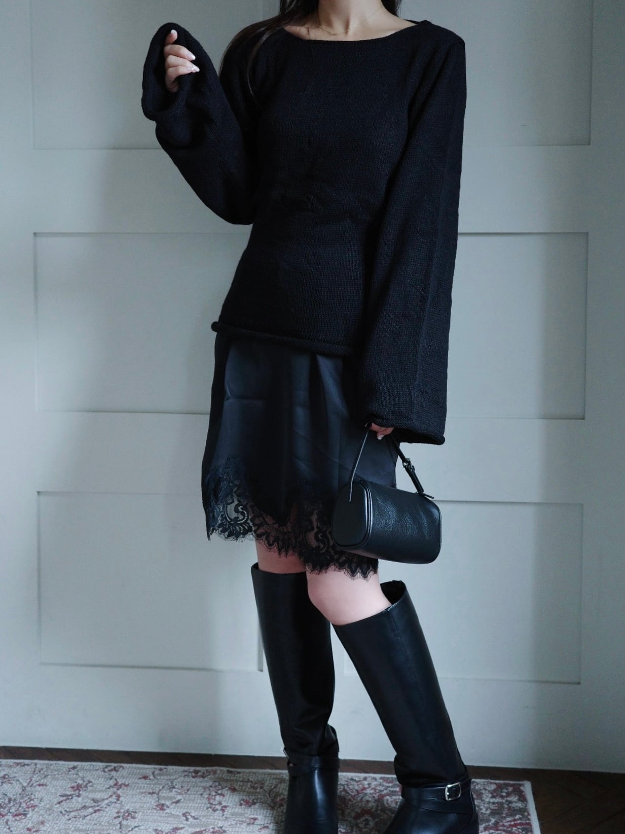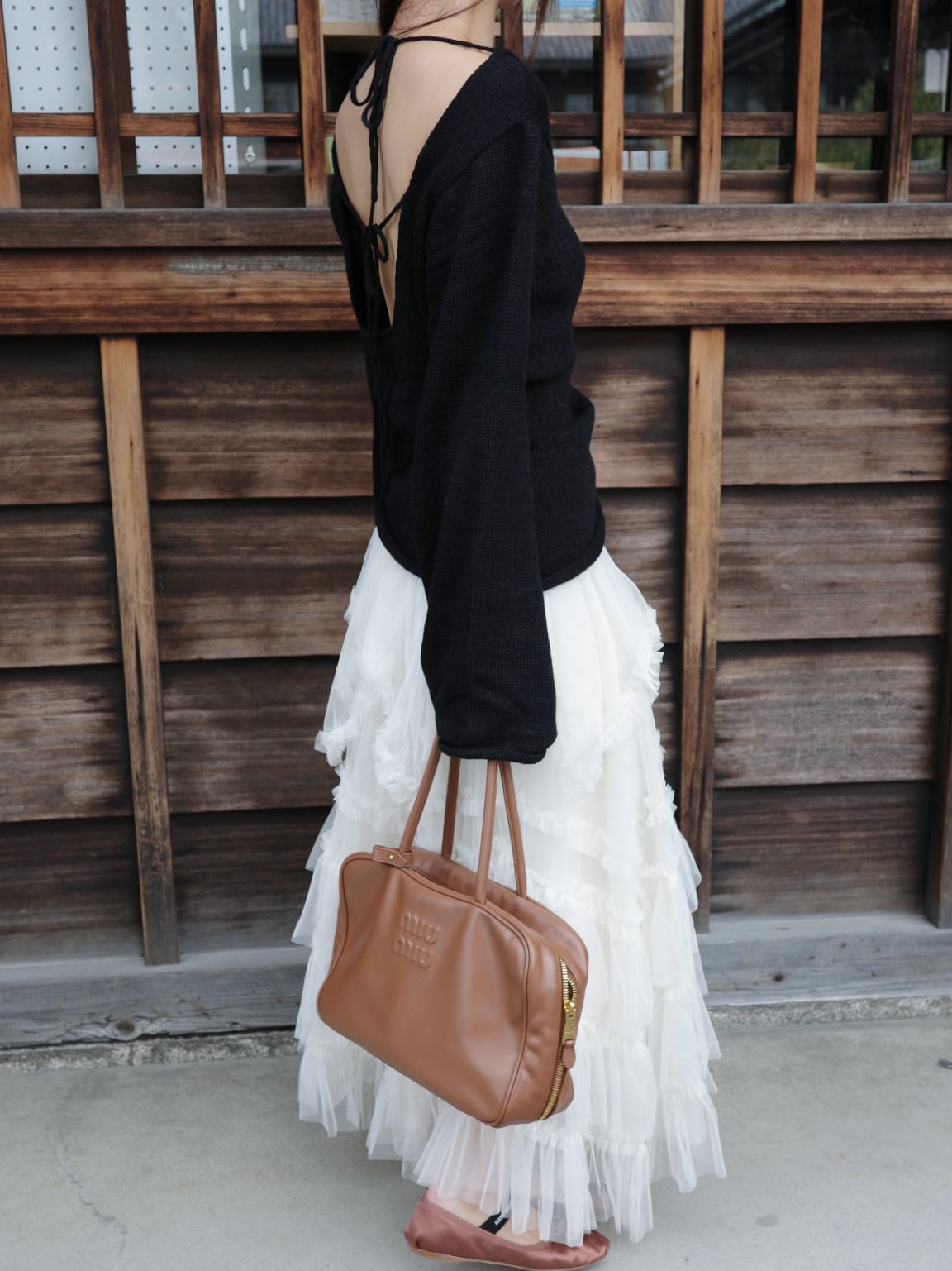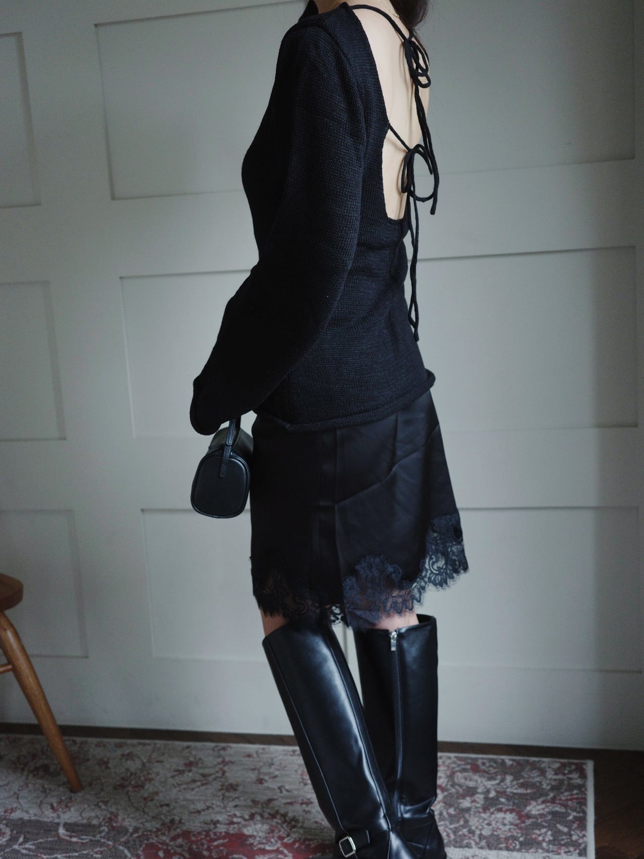 裾がくるんと丸まるロールヘムのベルスリーブがフェミニンな印象を添えるニットトップス。バックスタイルは大胆なカットアウトに華奢なリボンを効かせ、モード感と女性らしさを両立。シンプルなボトムスを合わせるだけで、洗練されたコーディネートが完成します。カジュアルなデニムからきれいめスカートまで、幅広いスタイリングにマッチする一枚。