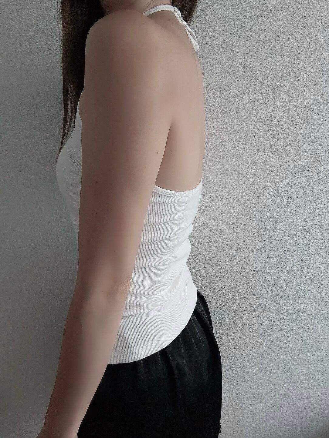 トップスのインナーや、カットソーの上からも重ねやすい、リブ素材のホルターネックキャミソール。