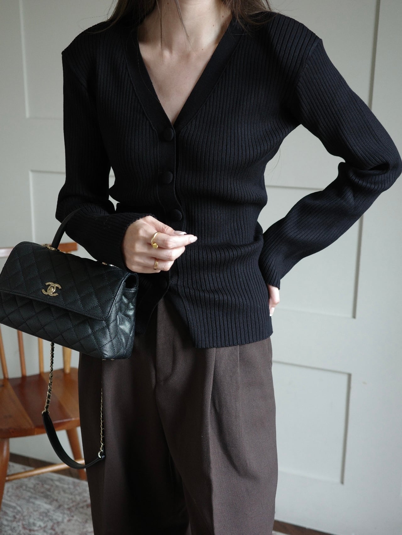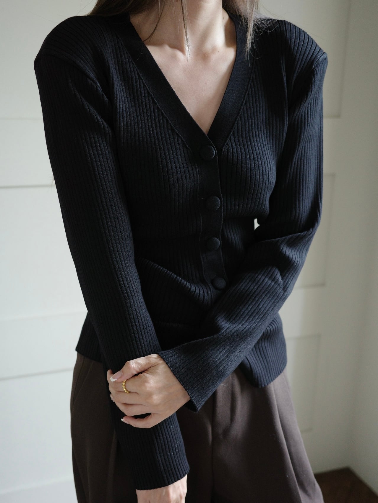 上品な印象を引き立てるリブVネックカーディガン。