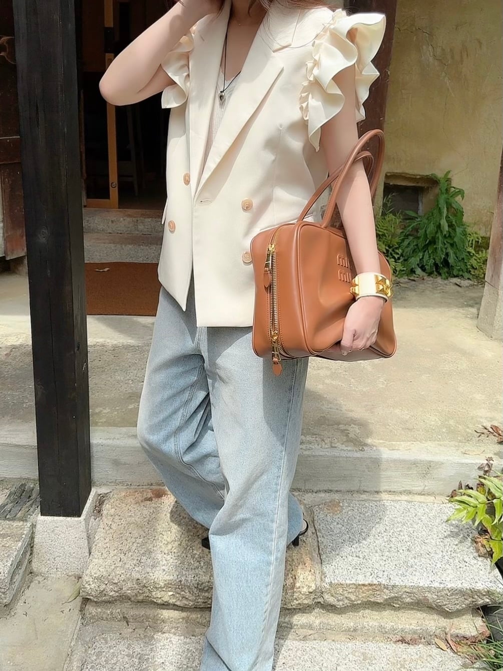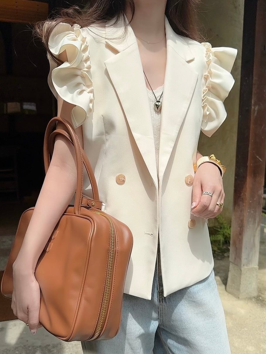 フリルショルダーでフェミニンなデザインですが、マニッシュさも兼ね備えたスタイリッシュなベストは、ブラウスやニットなどの上にサラッと一枚羽織るだけでコーディネートが華やぎます。