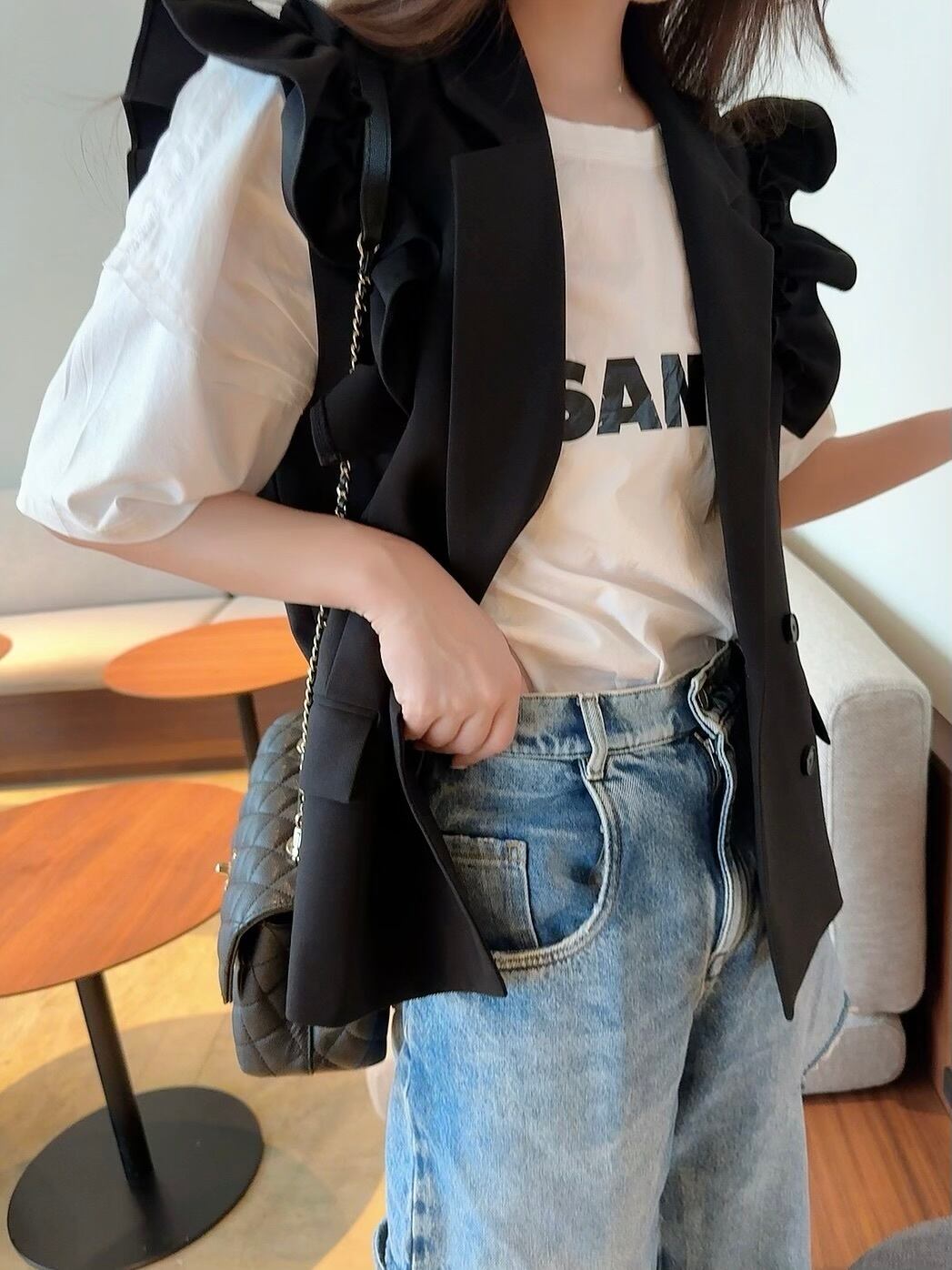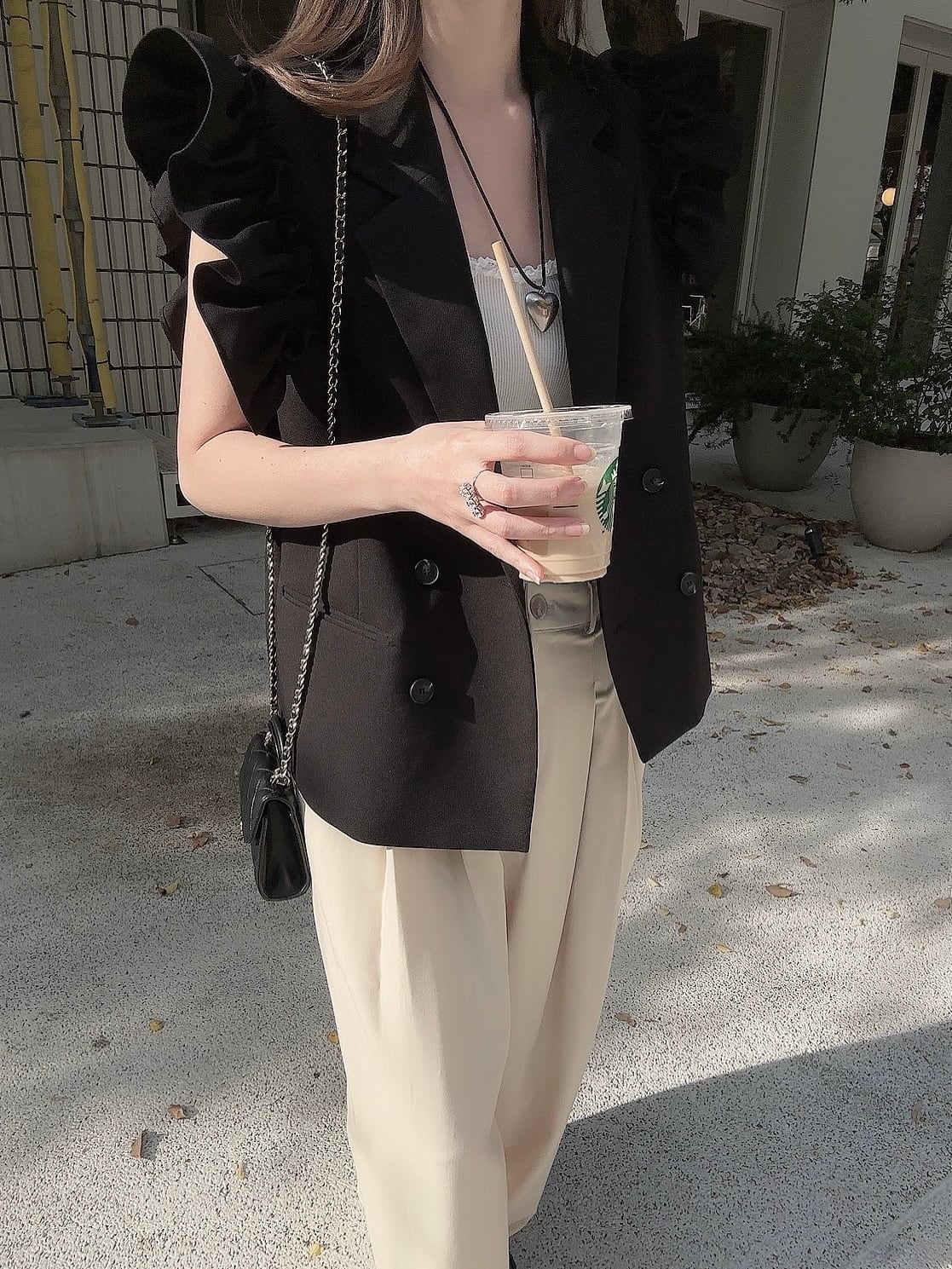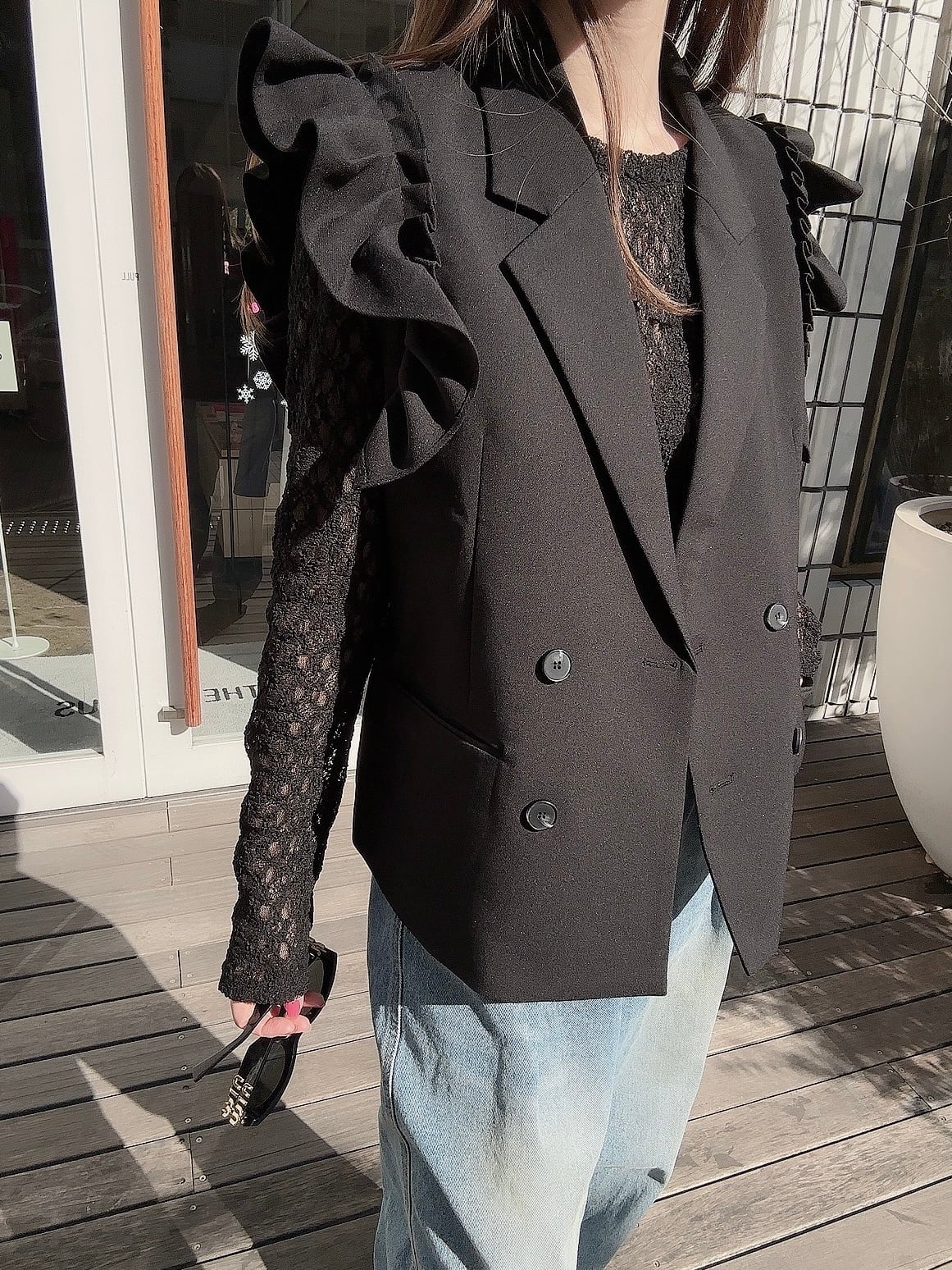 フリルショルダーでフェミニンなデザインですが、マニッシュさも兼ね備えたスタイリッシュなベストは、ブラウスやニットなどの上にサラッと一枚羽織るだけでコーディネートが華やぎます。