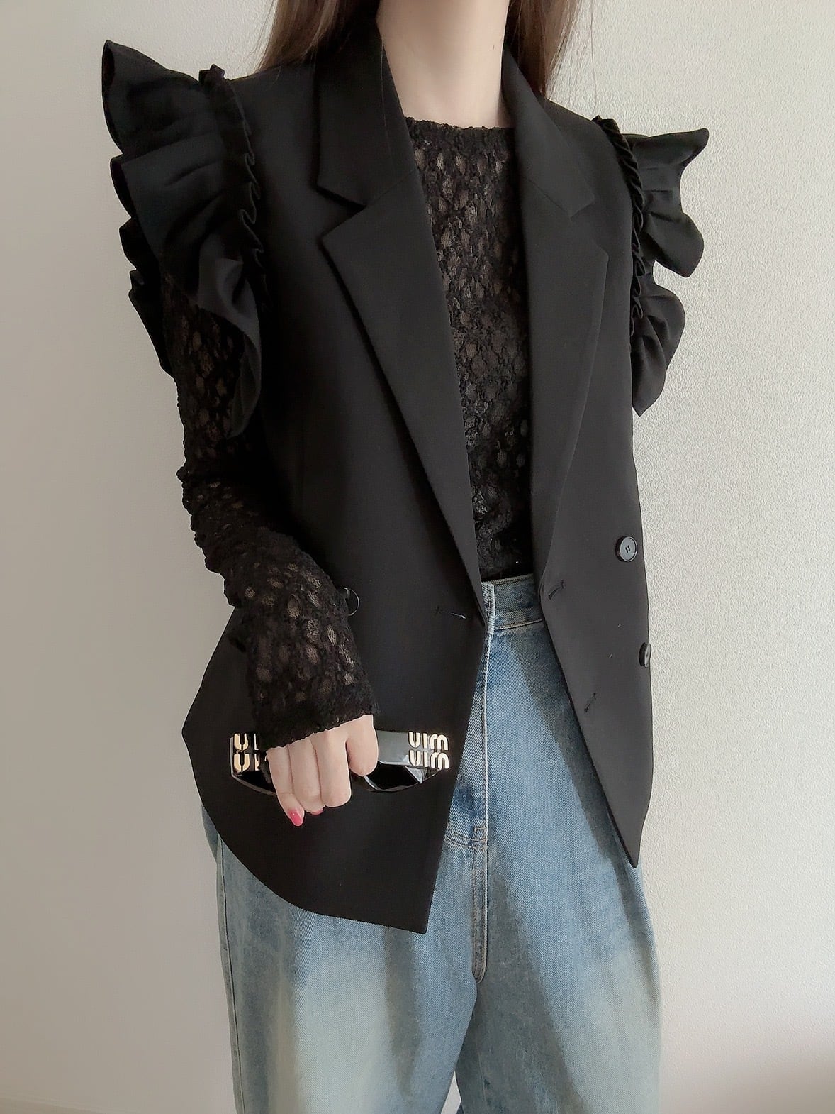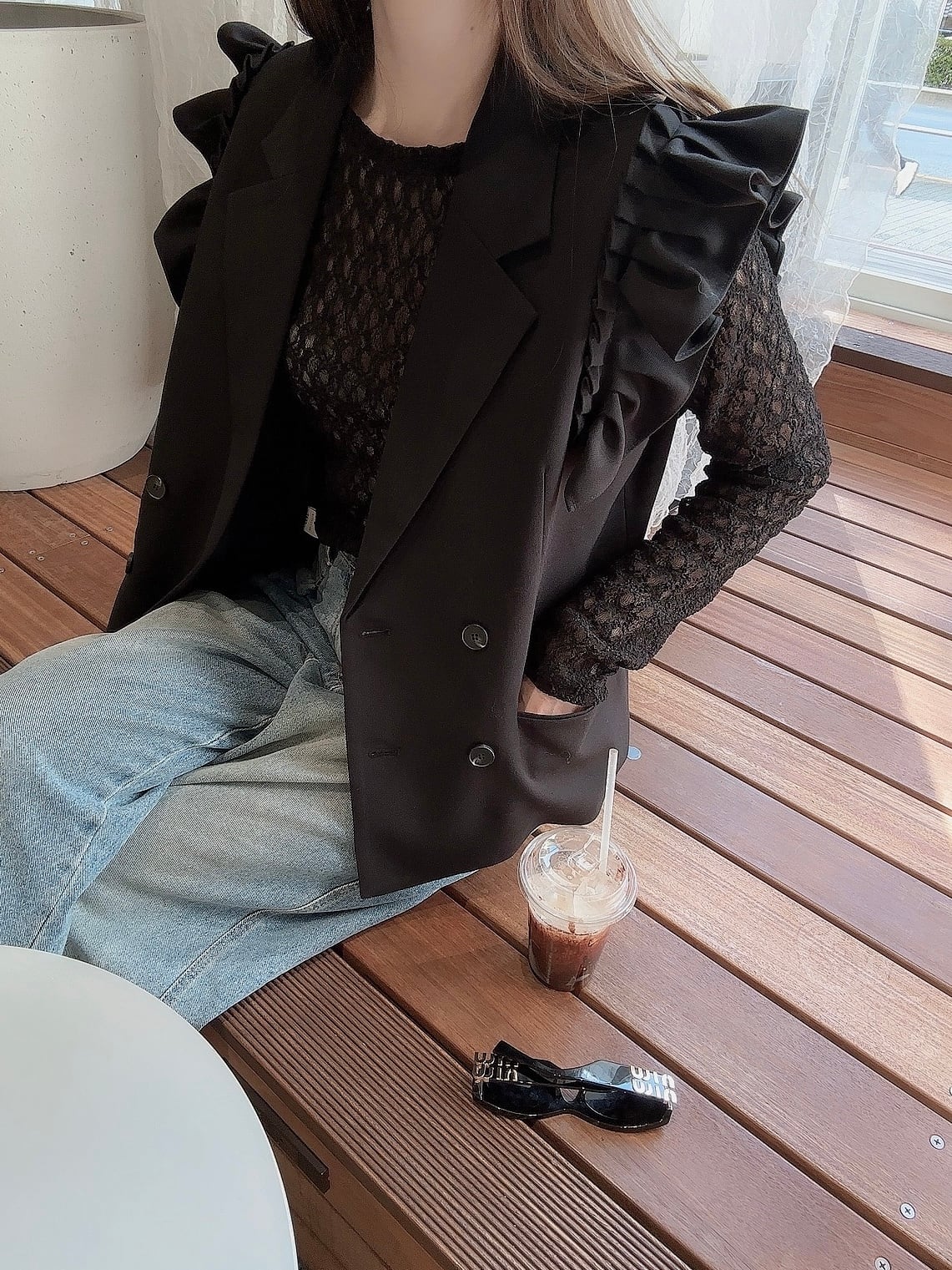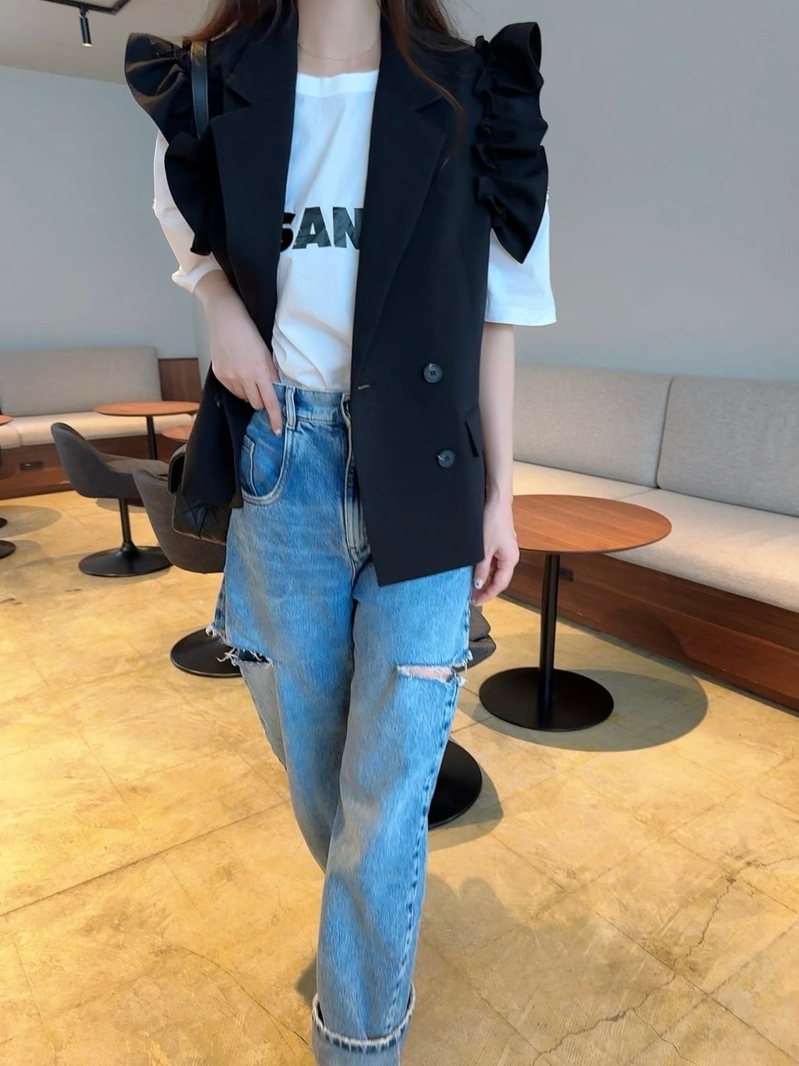 フリルショルダーでフェミニンなデザインですが、マニッシュさも兼ね備えたスタイリッシュなベストは、ブラウスやニットなどの上にサラッと一枚羽織るだけでコーディネートが華やぎます。