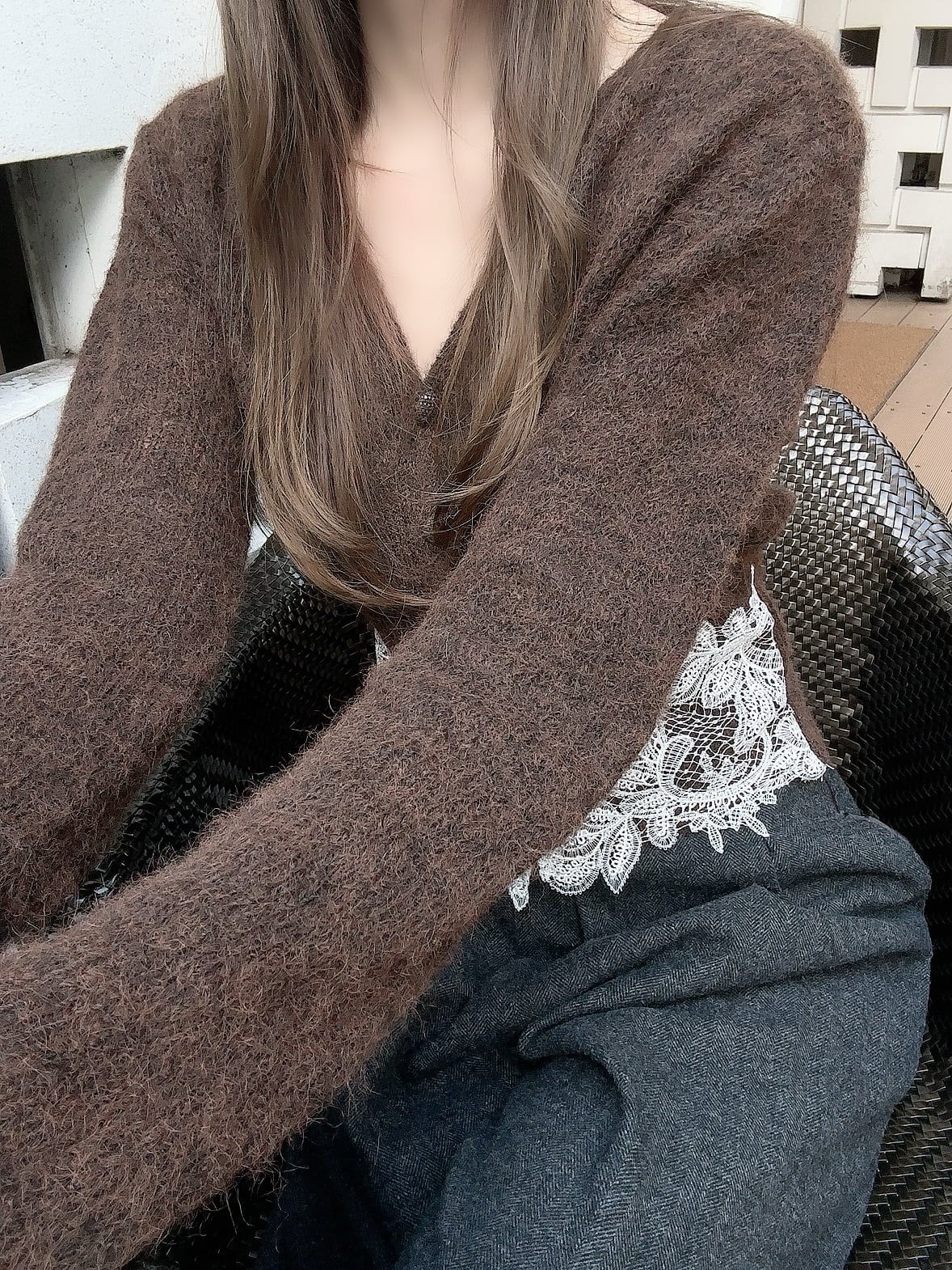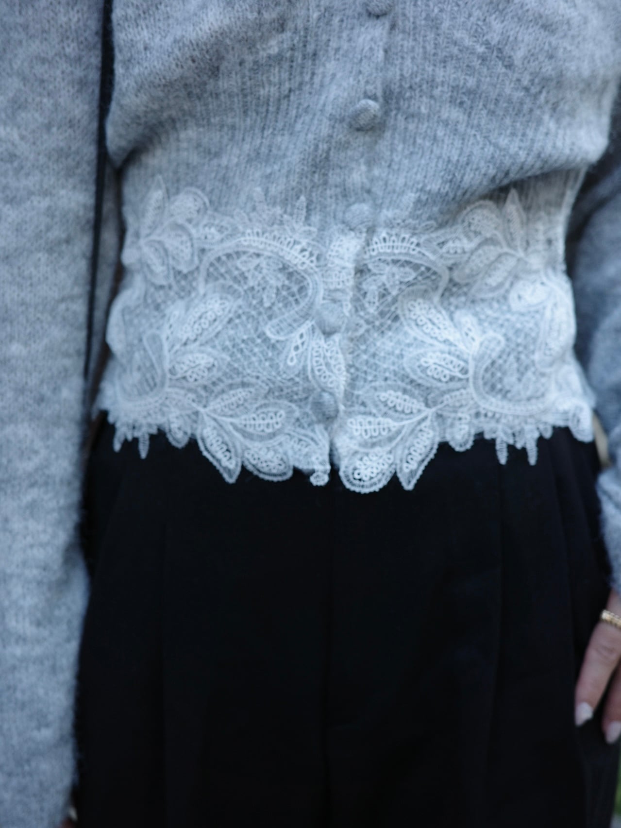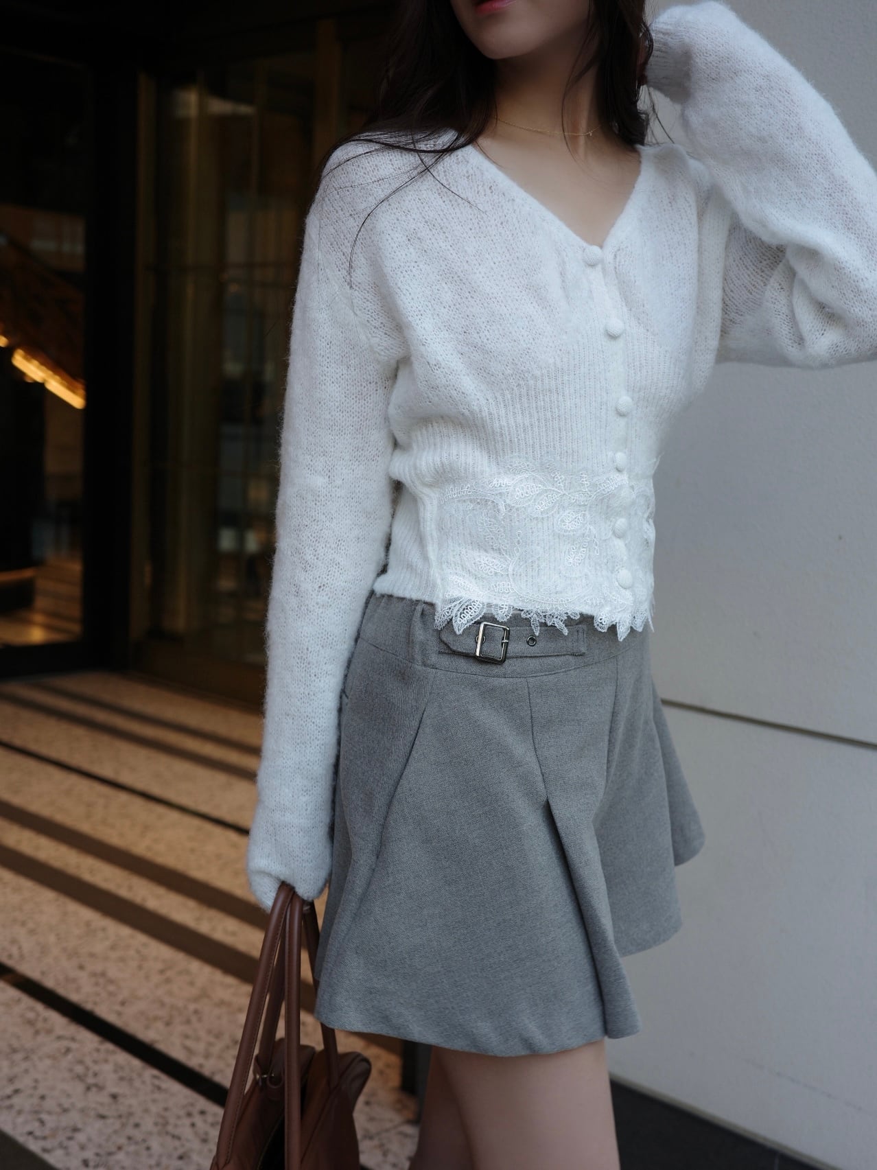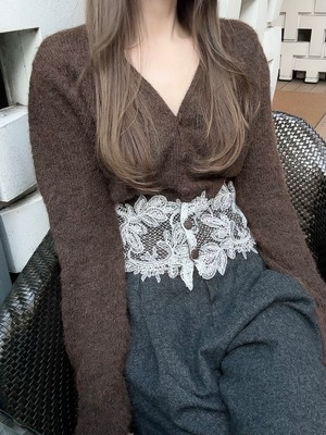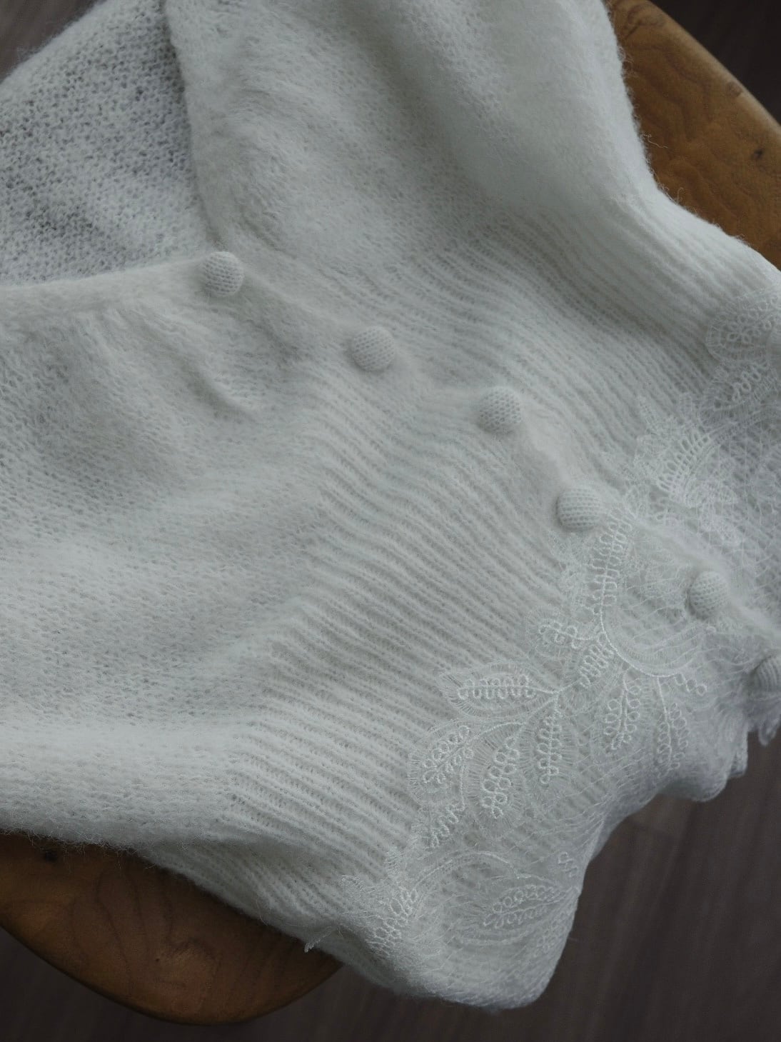 ふんわりと柔らかいモヘアタッチのデザインニット。フロント部分にあしらった繊細なレースディテールが、シンプルなシルエットにほどよい甘さをプラスします。立体感のある素材とレースのコンビネーションが、洗練されたムードを演出。程よいVネックラインが抜け感をつくり、1枚で着てもレイヤードしても映えるバランスに。