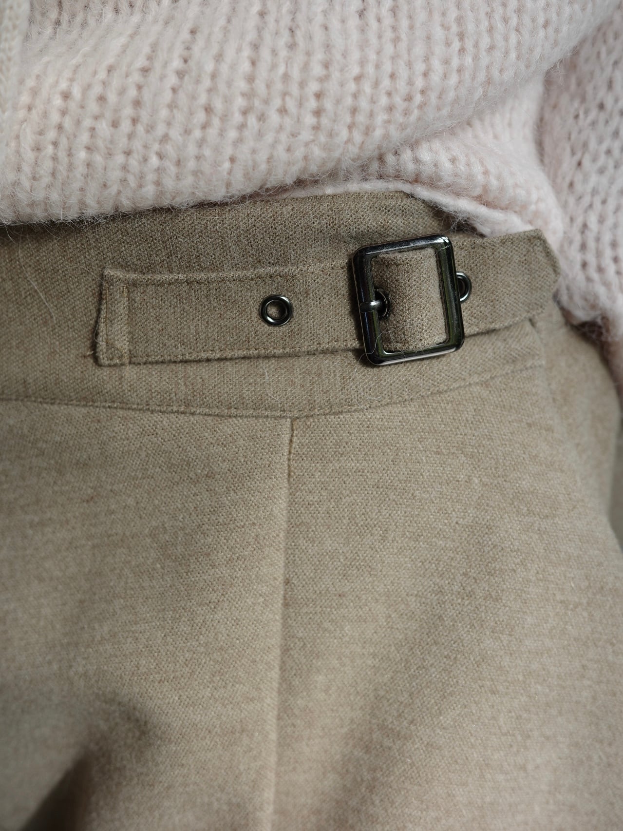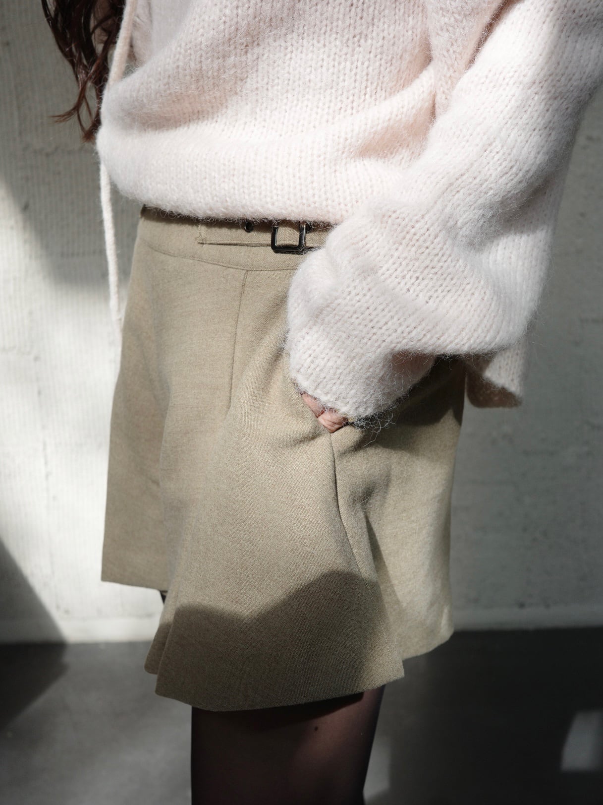 大人可愛いフレアなキュロットパンツ。サイドのベルトディティールがスタイリッシュなアクセントを加え、シンプルながらも存在感のあるデザインが魅力です。ニットとの相性も抜群で、これからの季節にピッタリなアイテムです。 フレアなシルエットは、動きやすさだけでなく、太もも周りをさりげなくカバーし、脚をすっきり長く見せてくれる美脚効果も◎