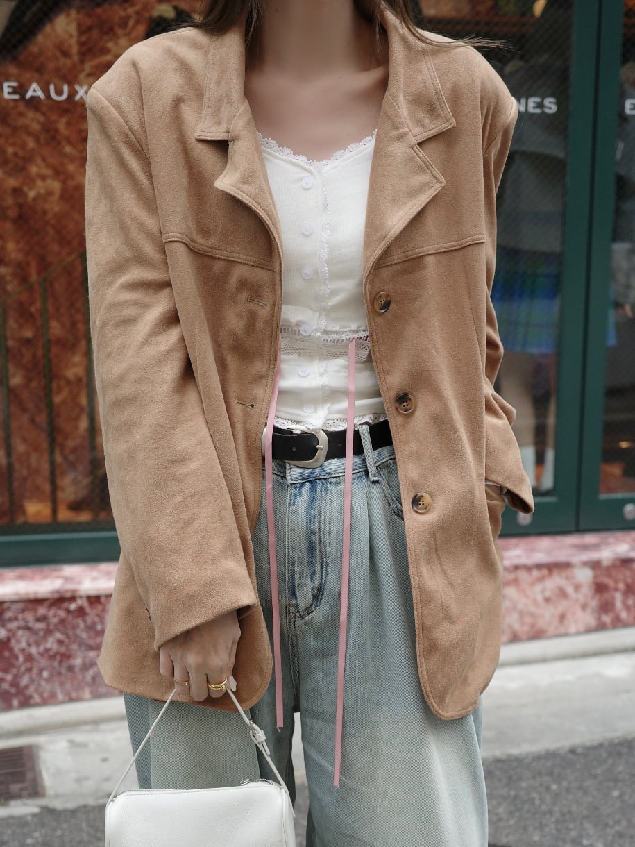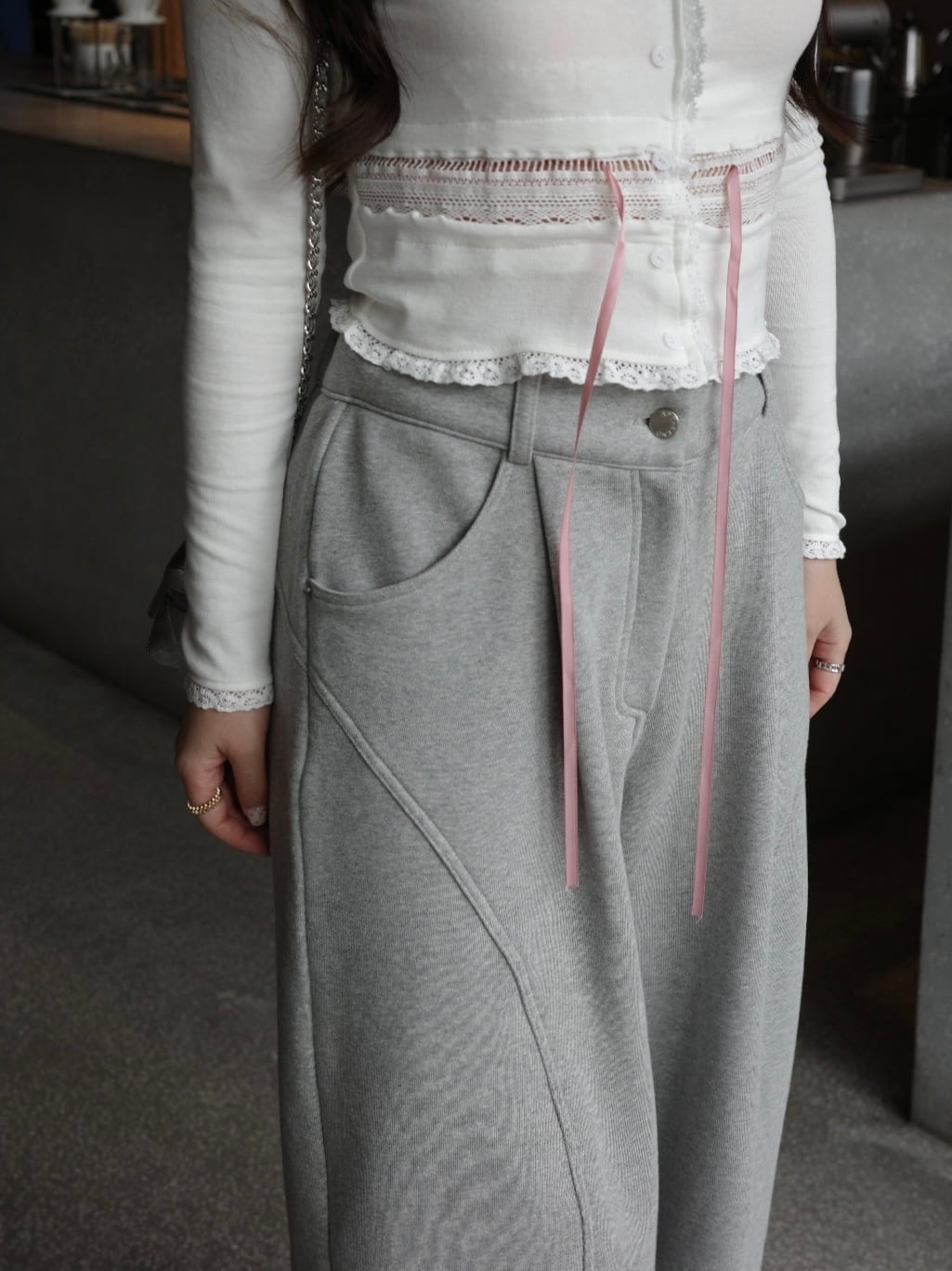 フロントのボタンは開閉不可の飾りデザインと、ウエスト部分のレース切り替えとピンクの細リボンディテールがさりげないアクセントになり、大人可愛いコーデの主役に。