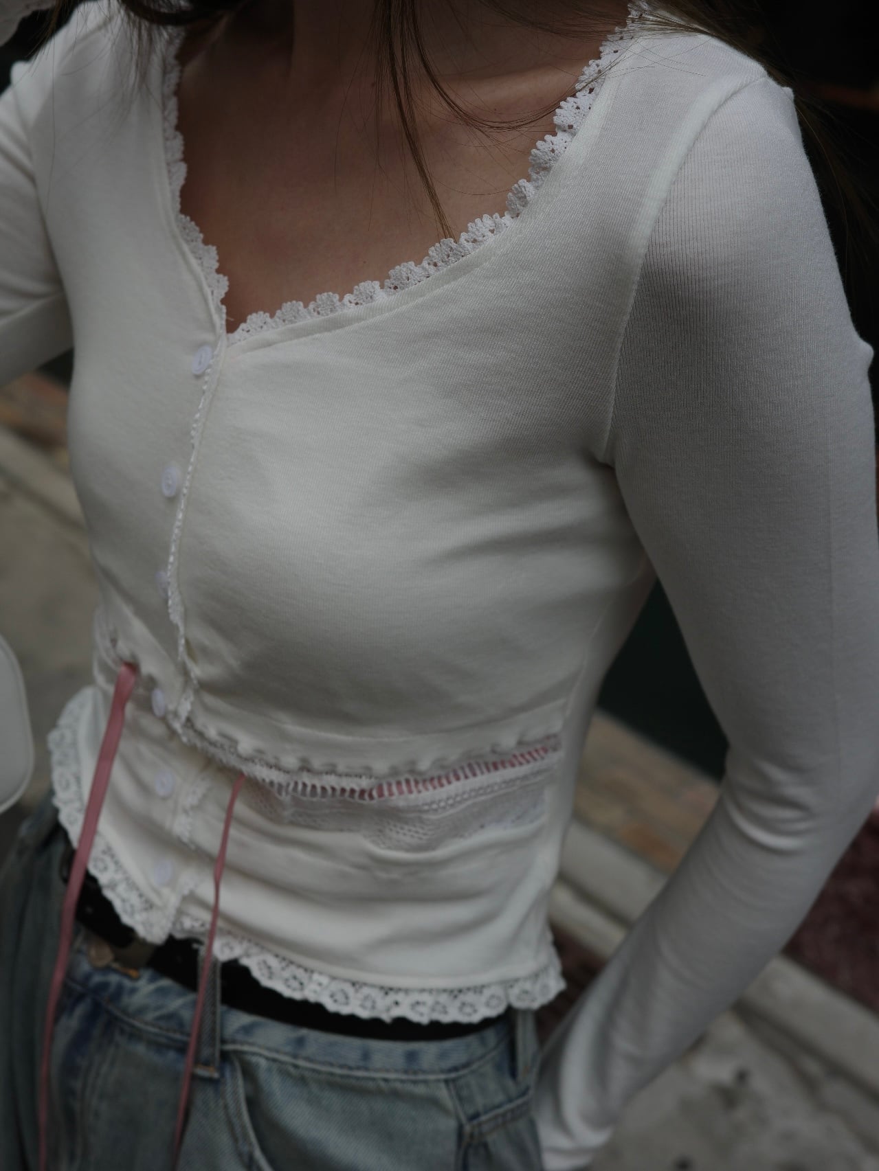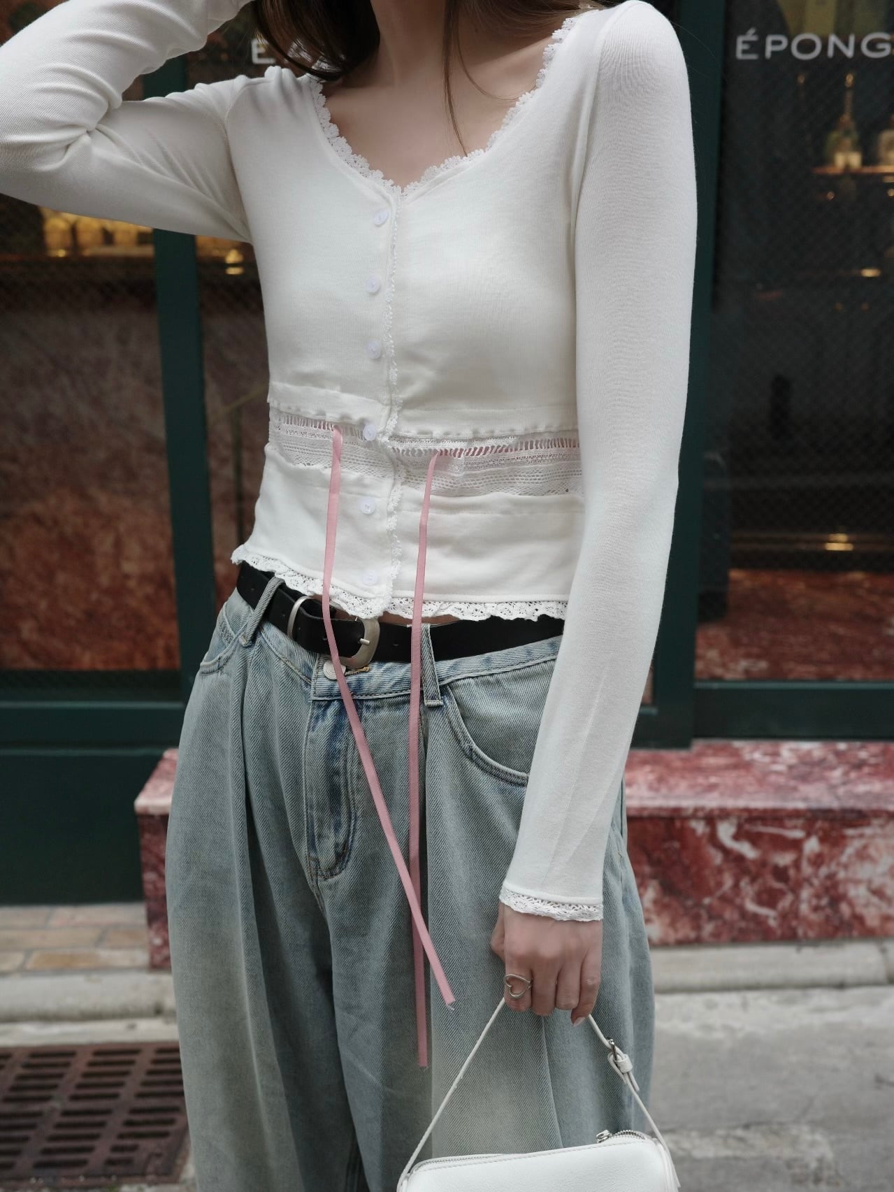 小ぶりな繊細レースをあしらった、女性らしさ溢れるトップス。