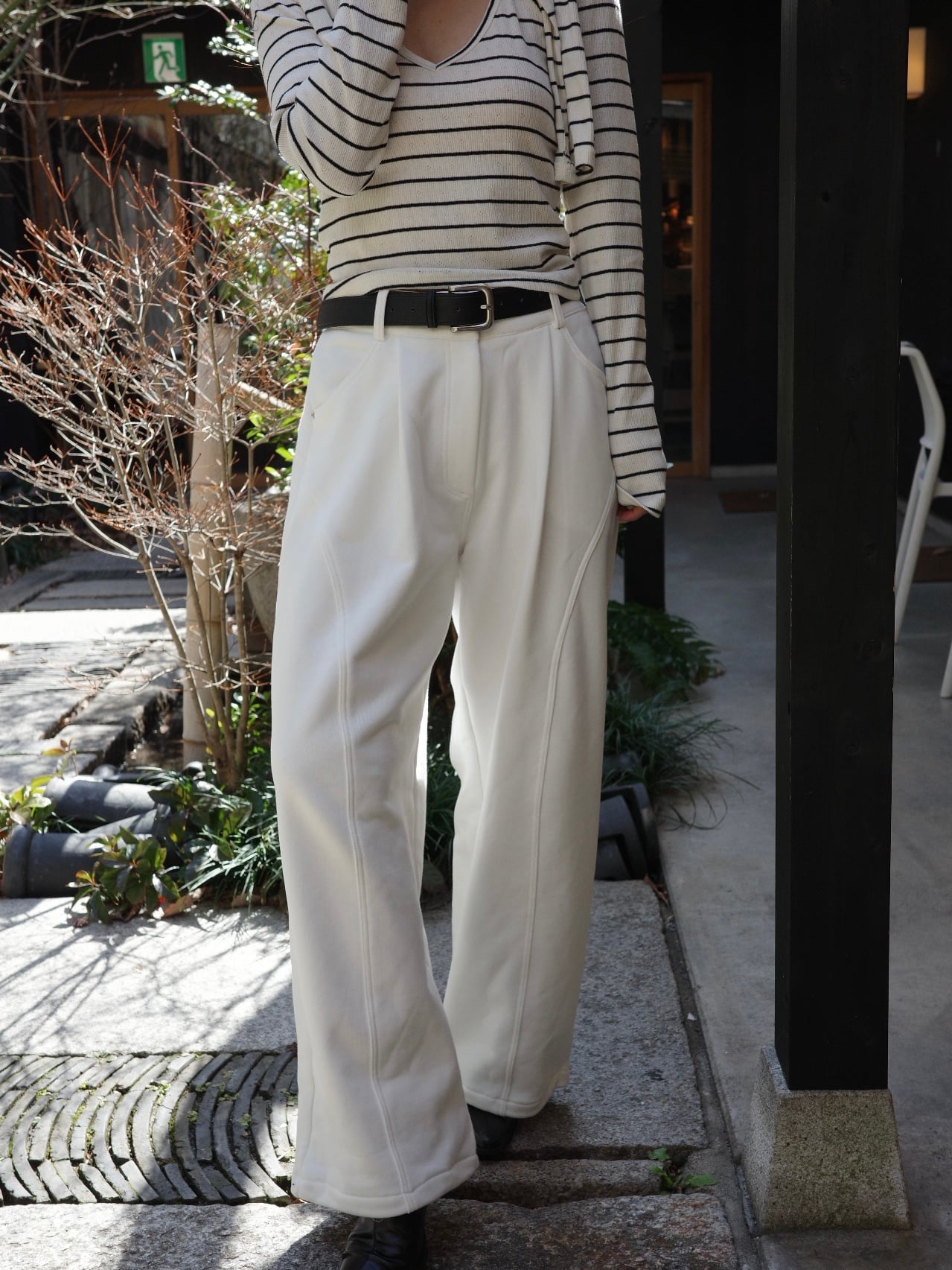 腰まわりから太ももにかけては適度なゆとりをもたせ、リラックスした履き心地でありながらも、すっきりと洗練された印象に。