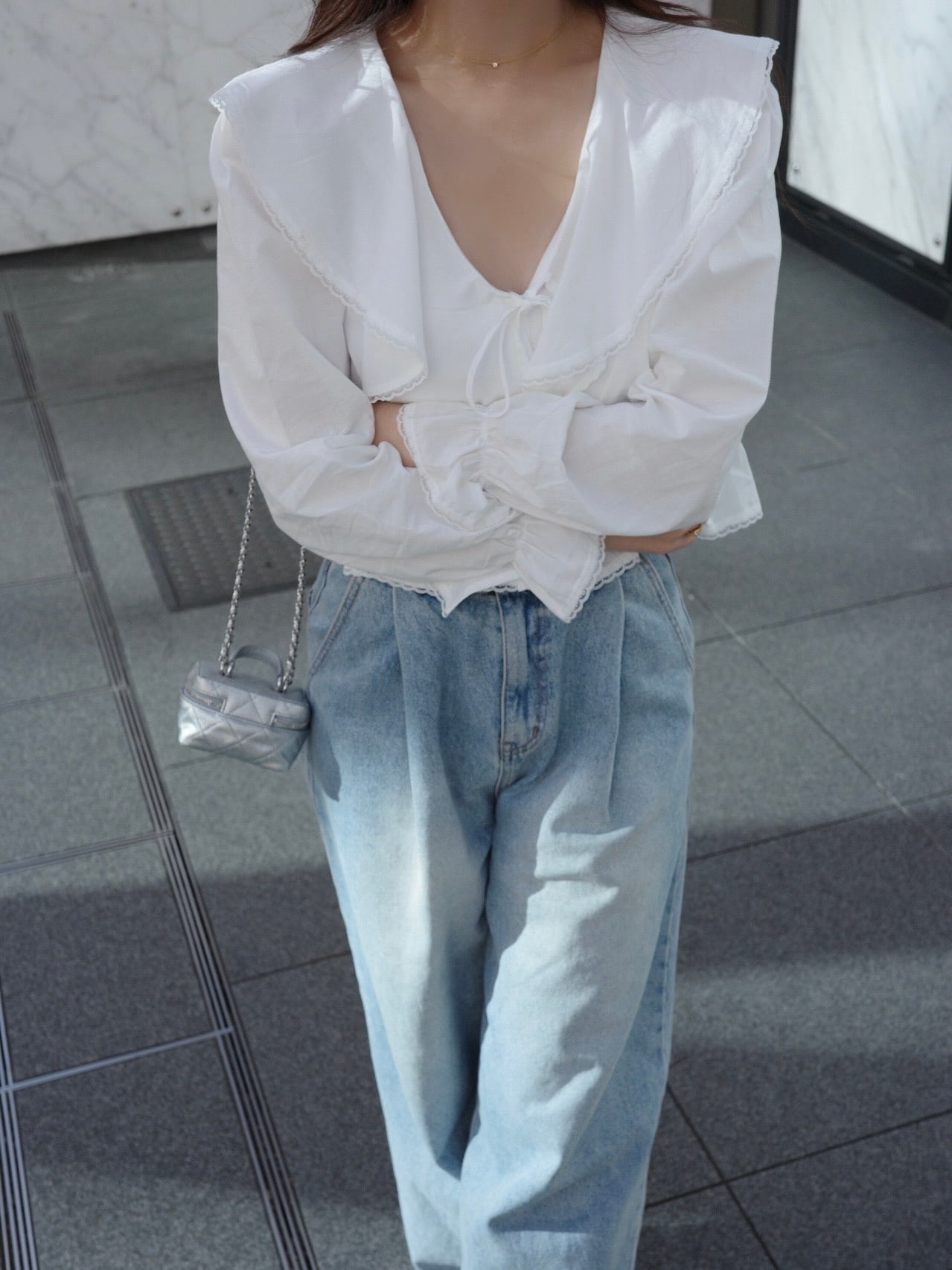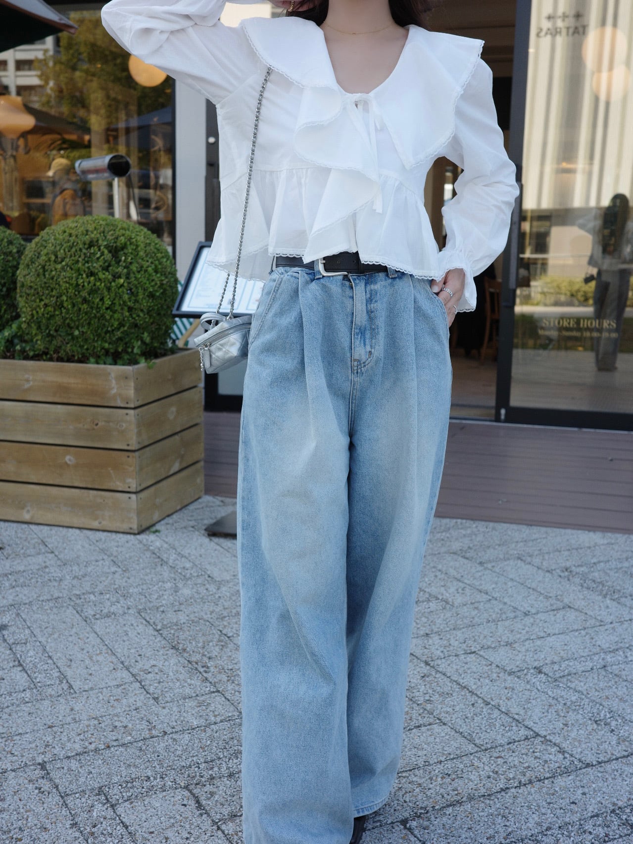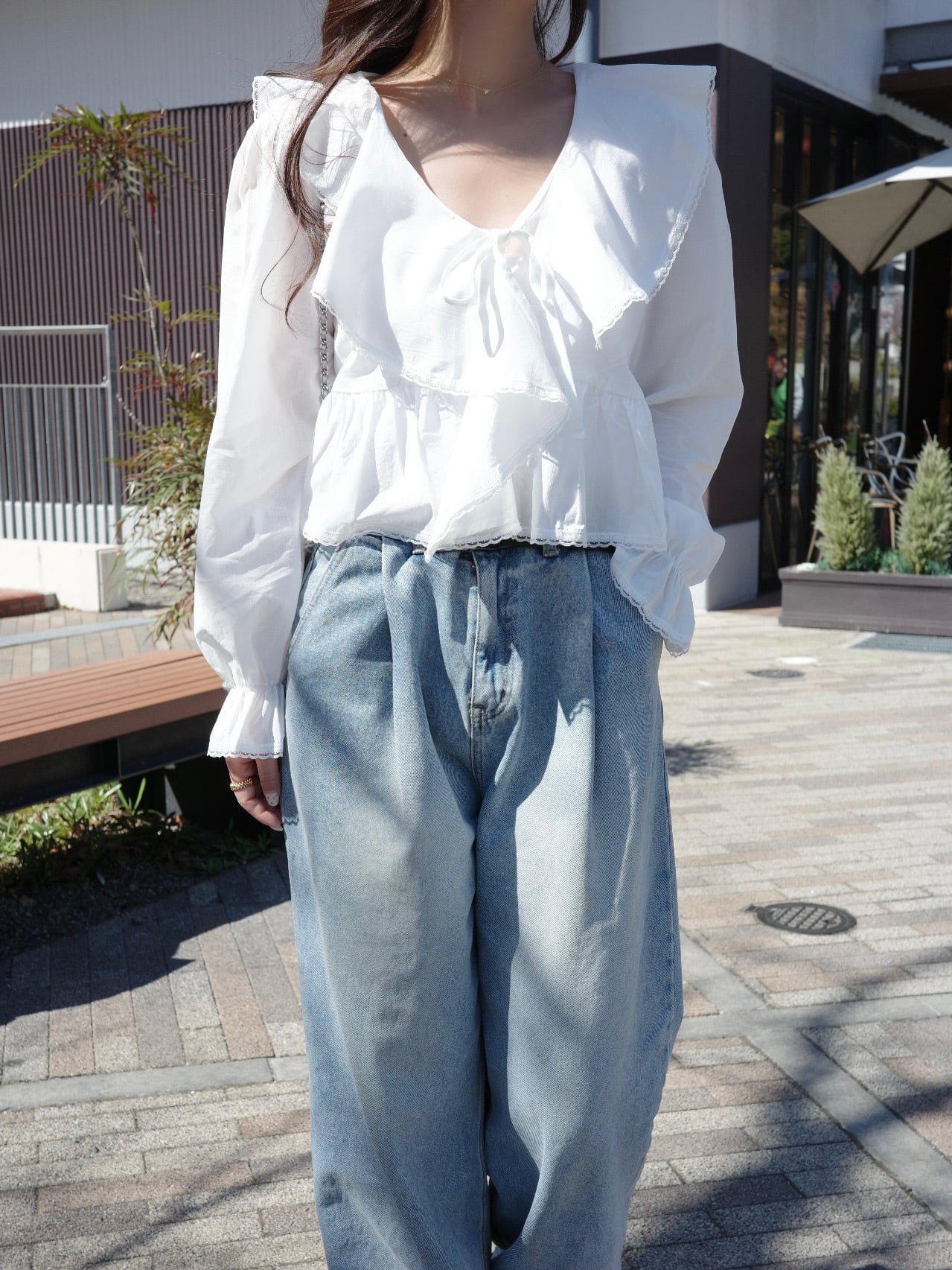 ナチュラルな可愛さを引き立てる、フェミニンなフリルブラウス。