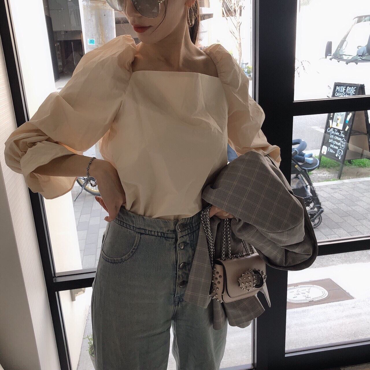 袖のボリューム感たっぷりのパフショルダーブラウス。