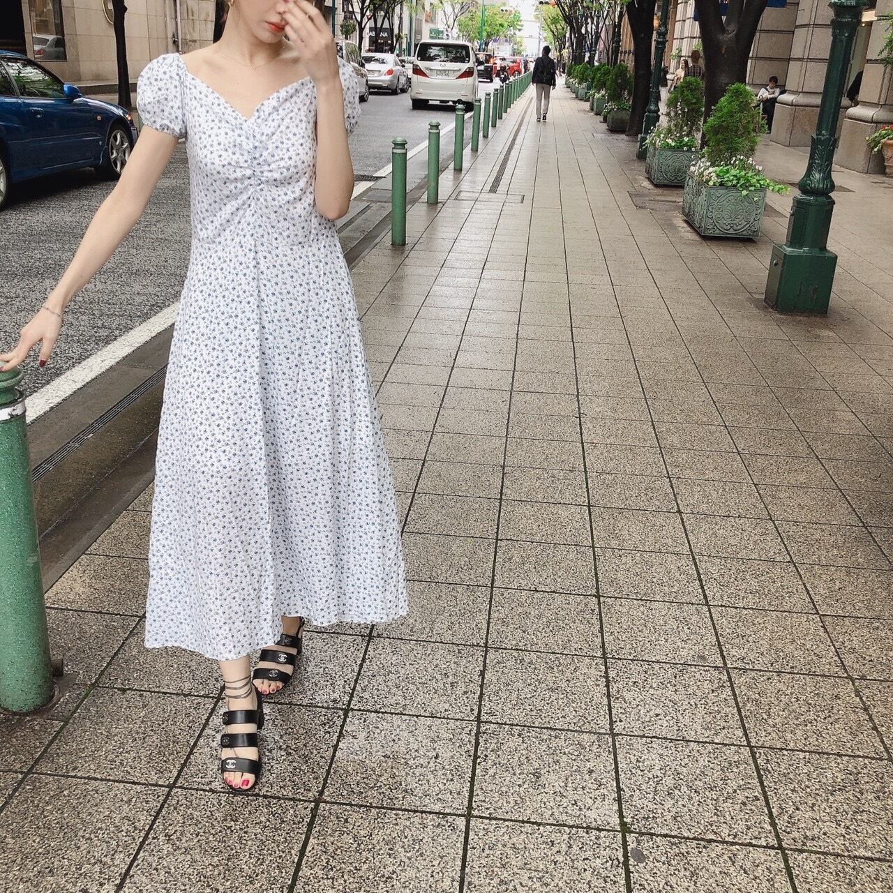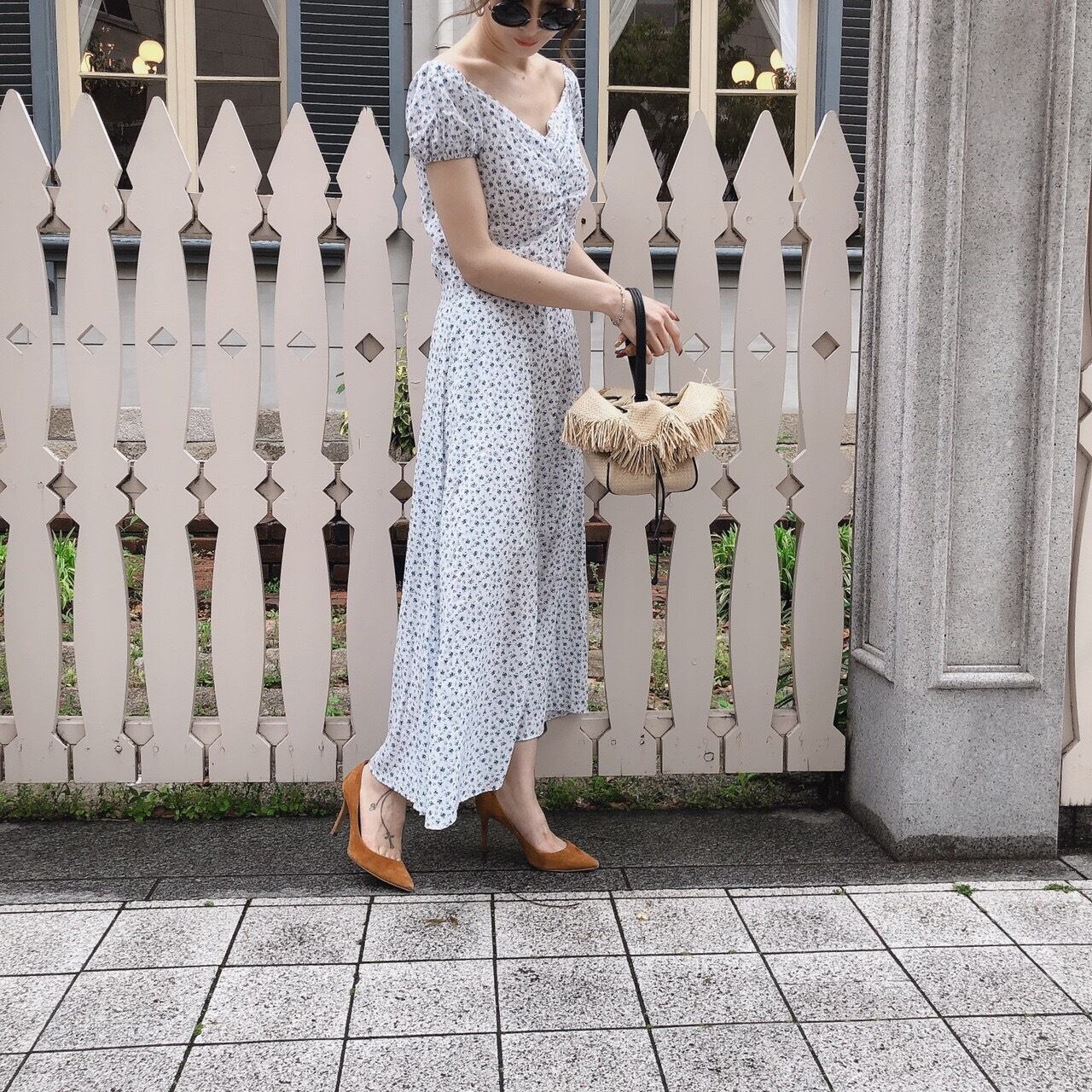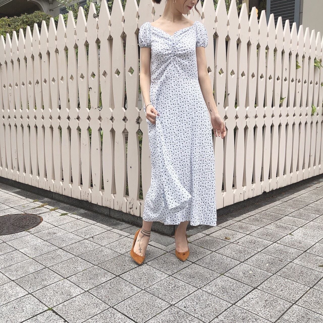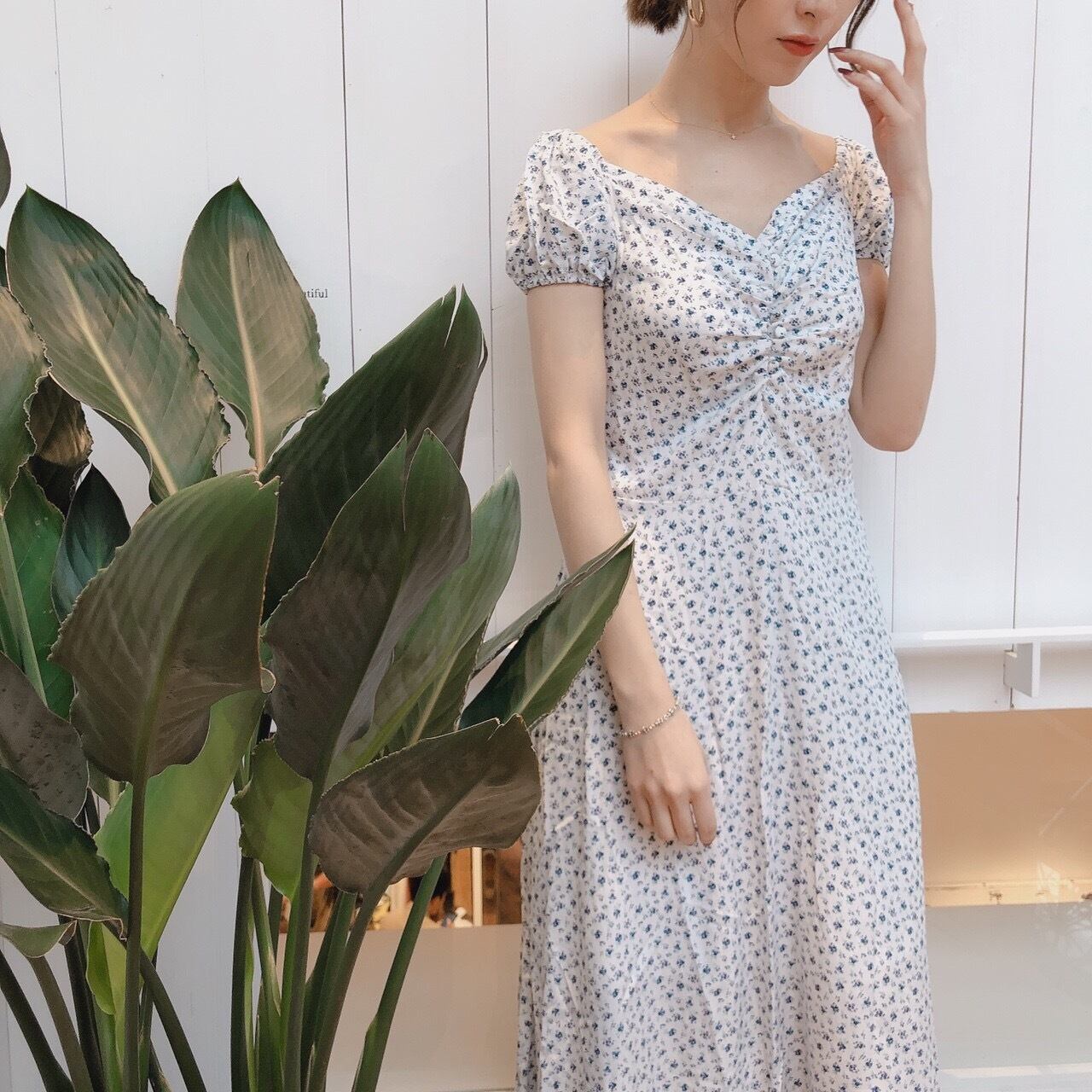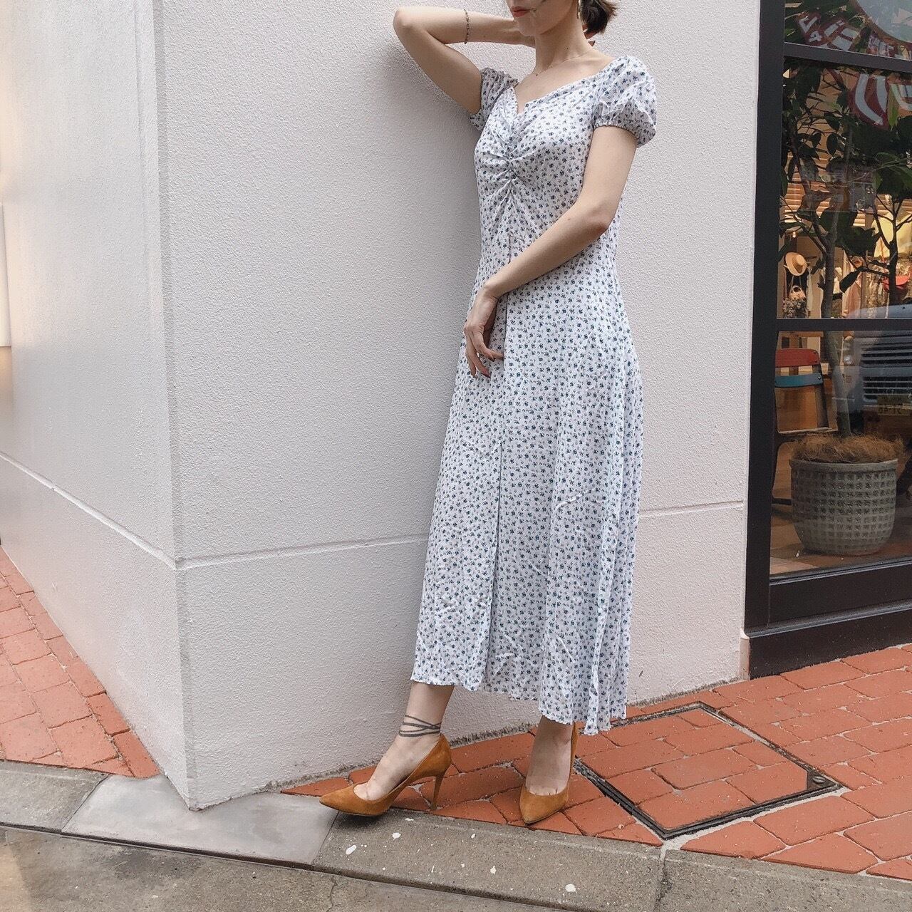 白地にブルーの小花がとても爽やかなサマーロングワンピース。