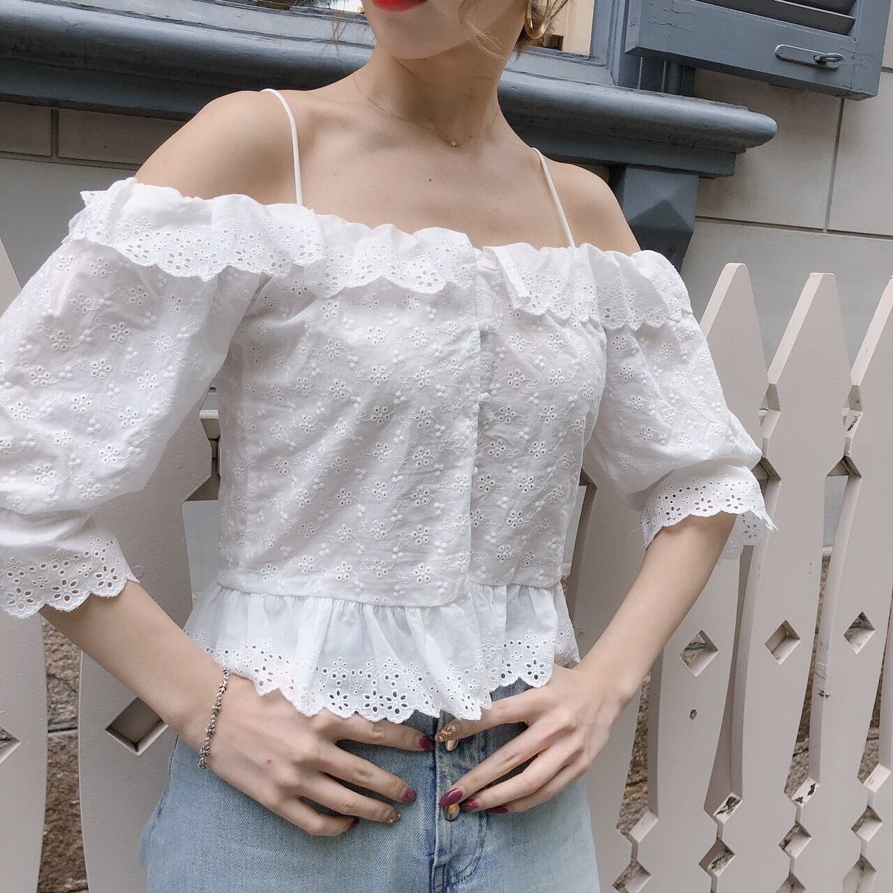 夏に絶対可愛いアイレットブラウスをmoriponではオフショルダーのデザインでさらに可愛く。