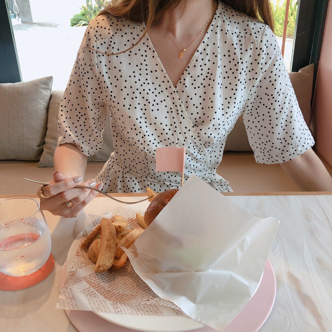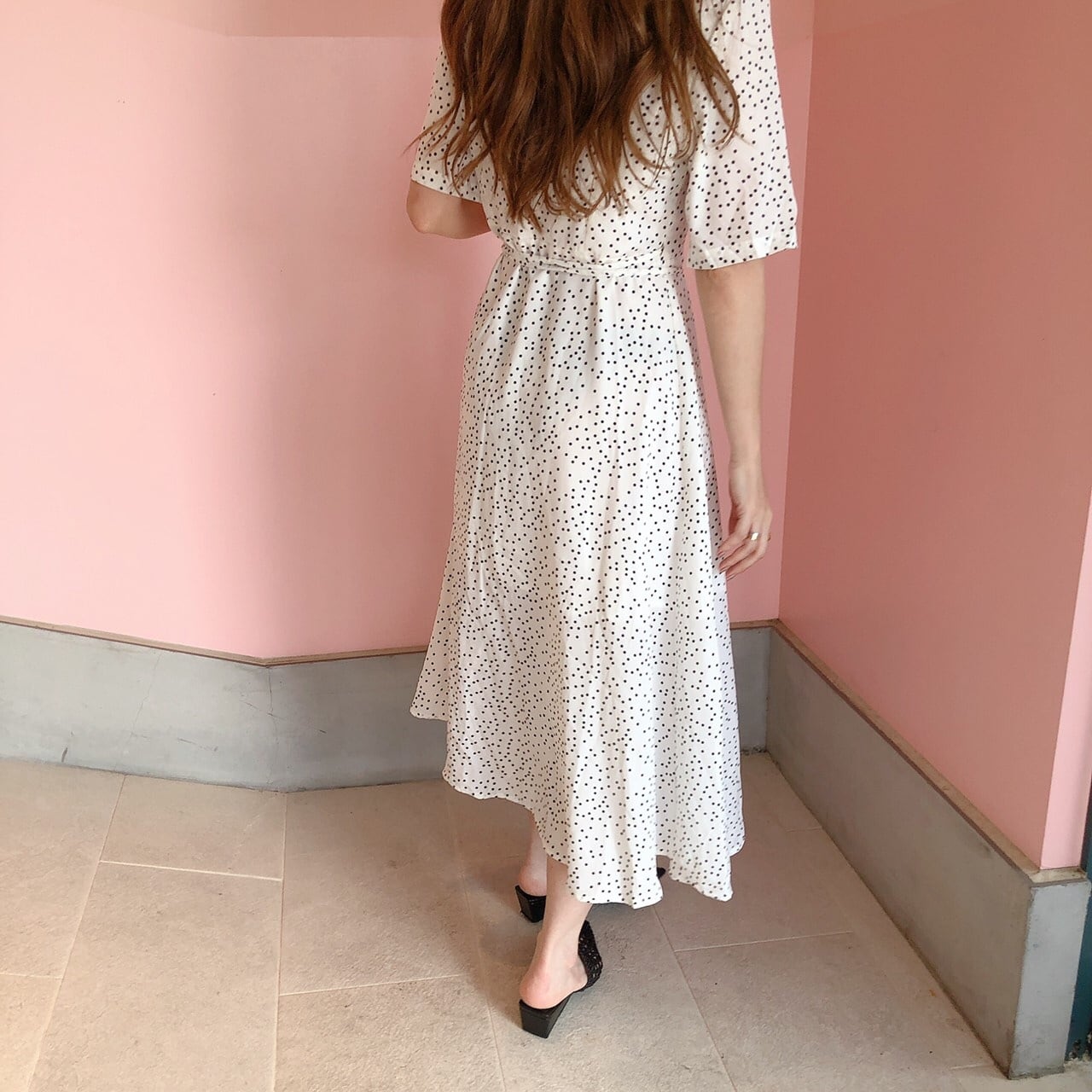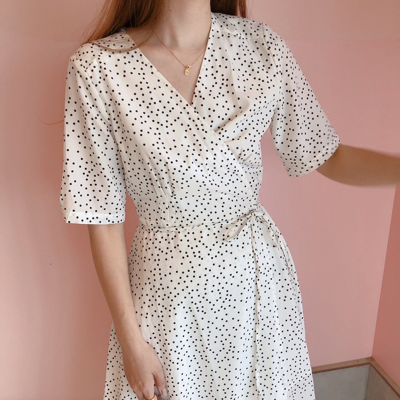 夏に欠かせないキュートなドット柄が目を惹くラップワンピース。
