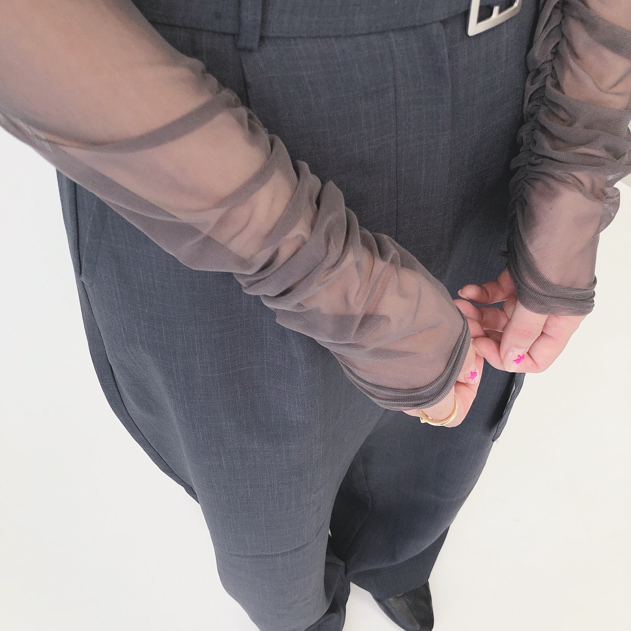 シアーのハイネックトップスは、程よい透け感が着こなしのアクセントに。