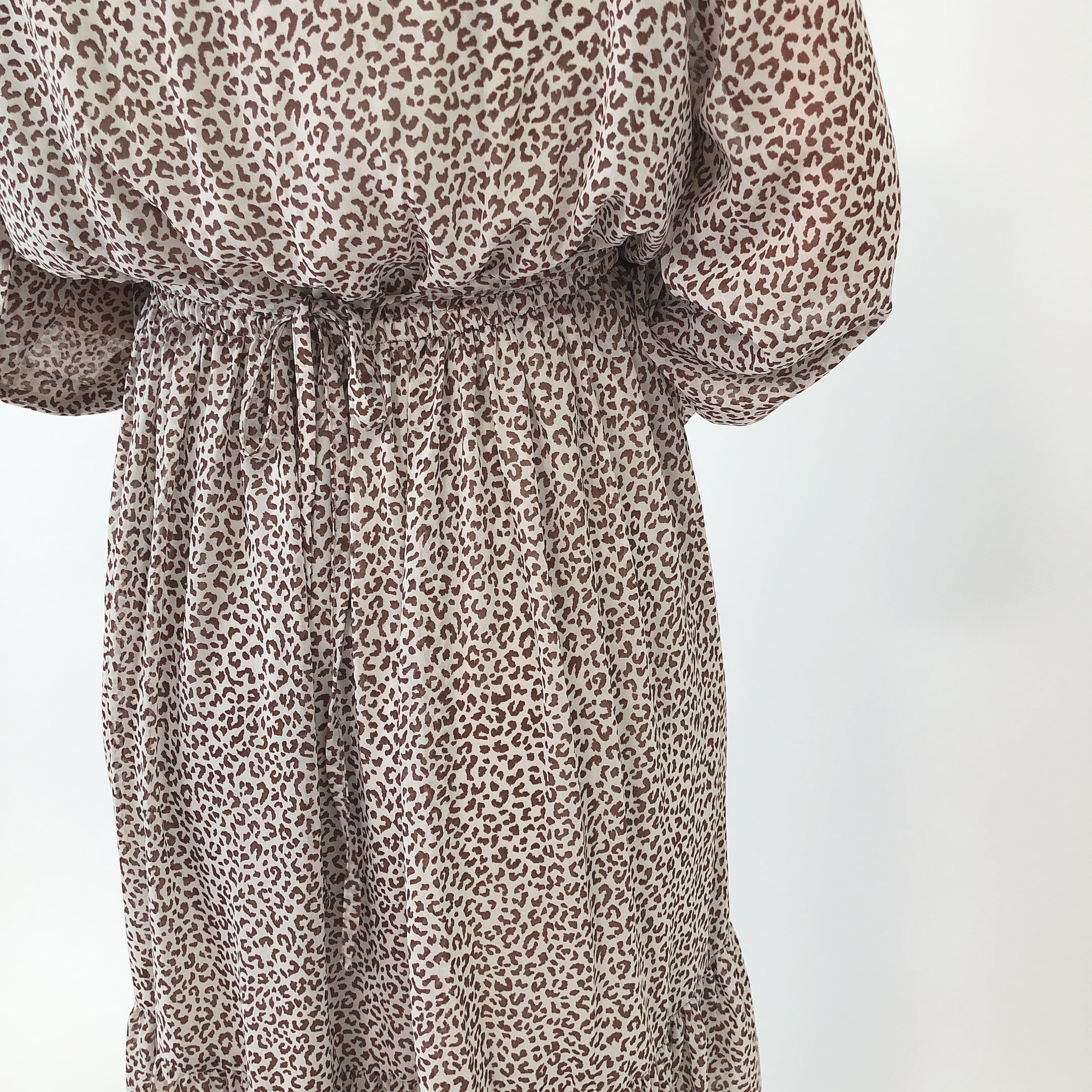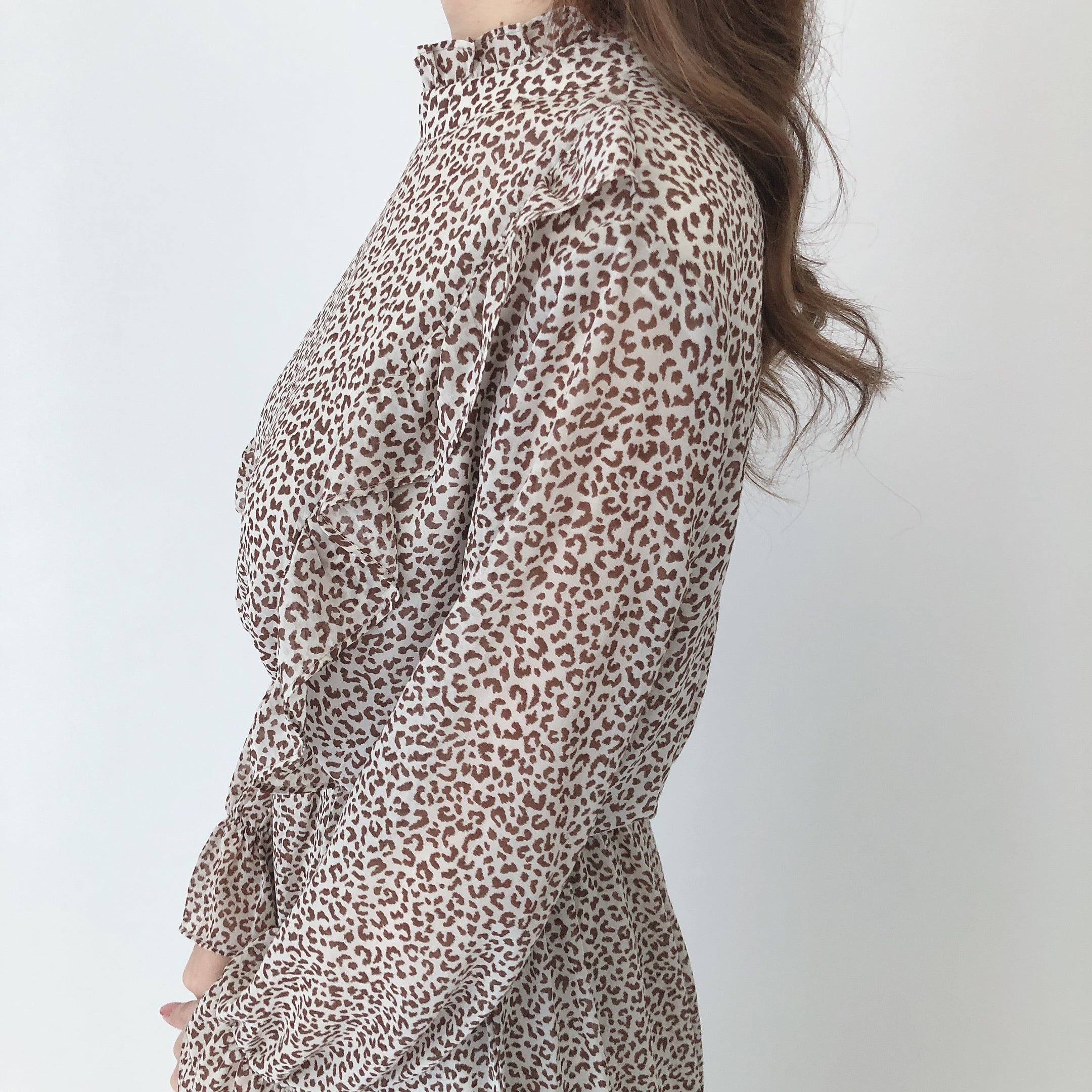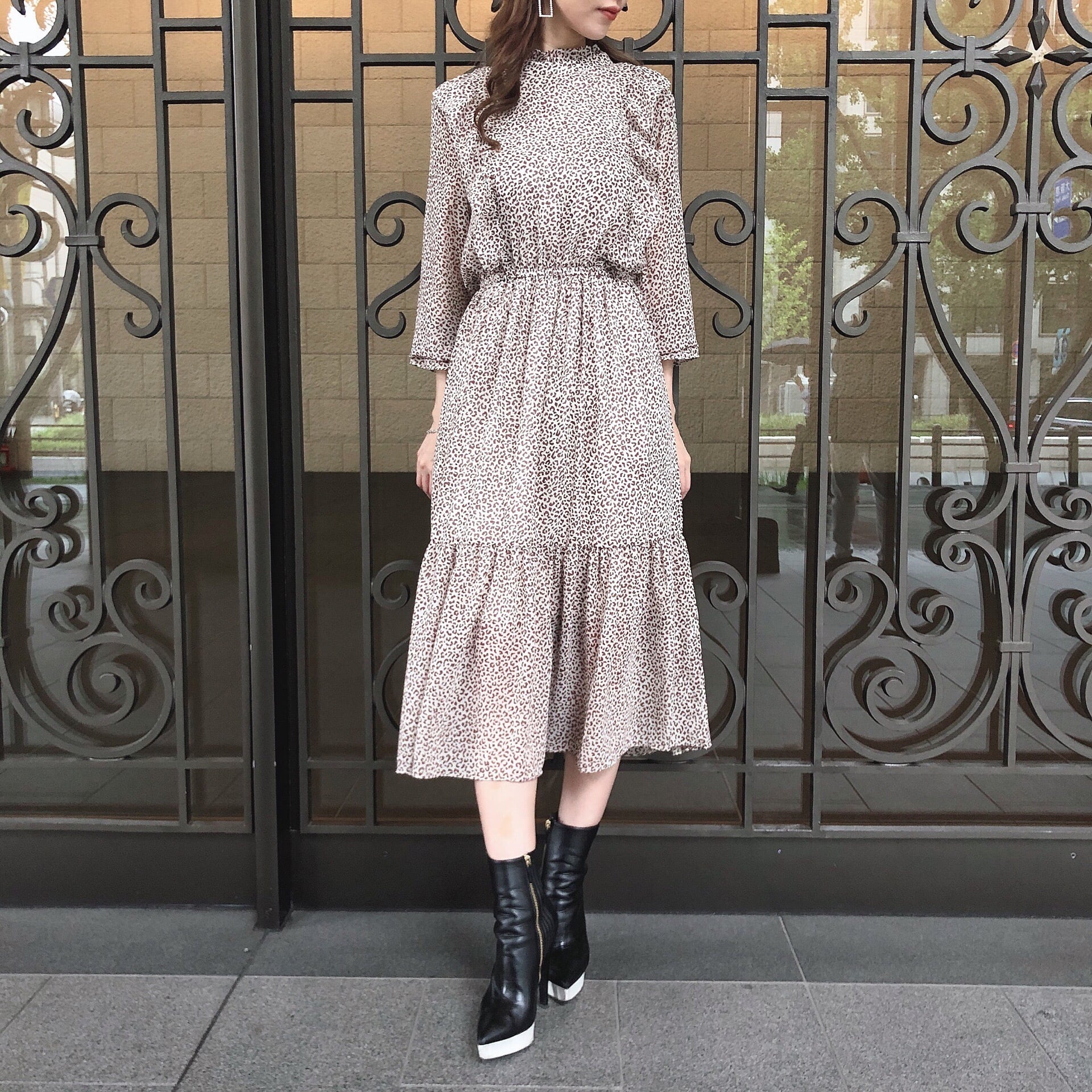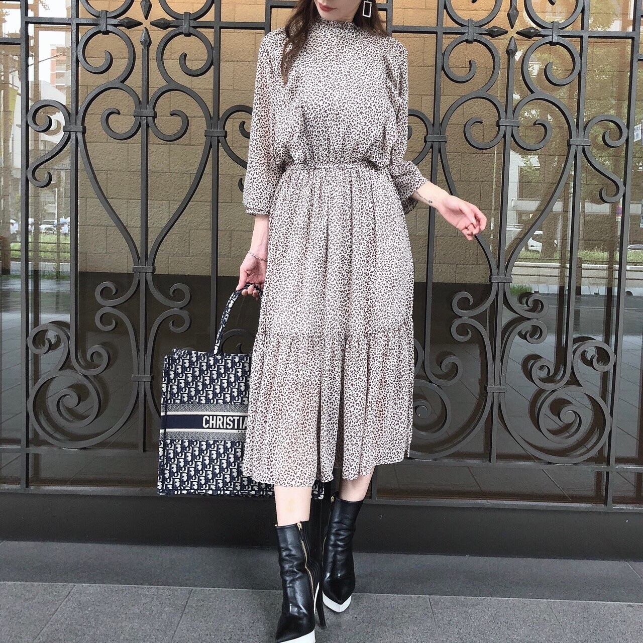 秋冬必須アイテムのレオパード柄のワンピースはハイネックのデザインがレディな印象に。