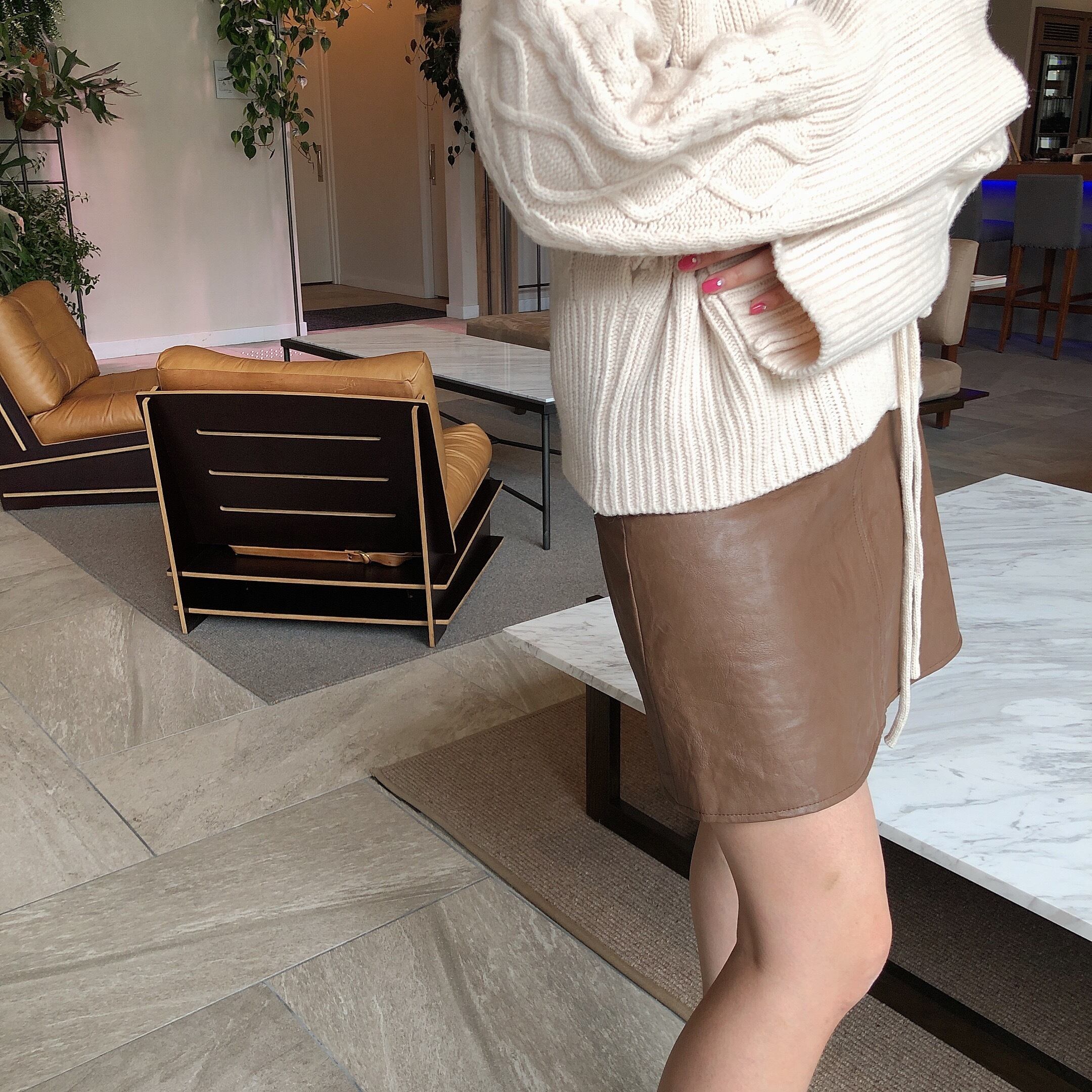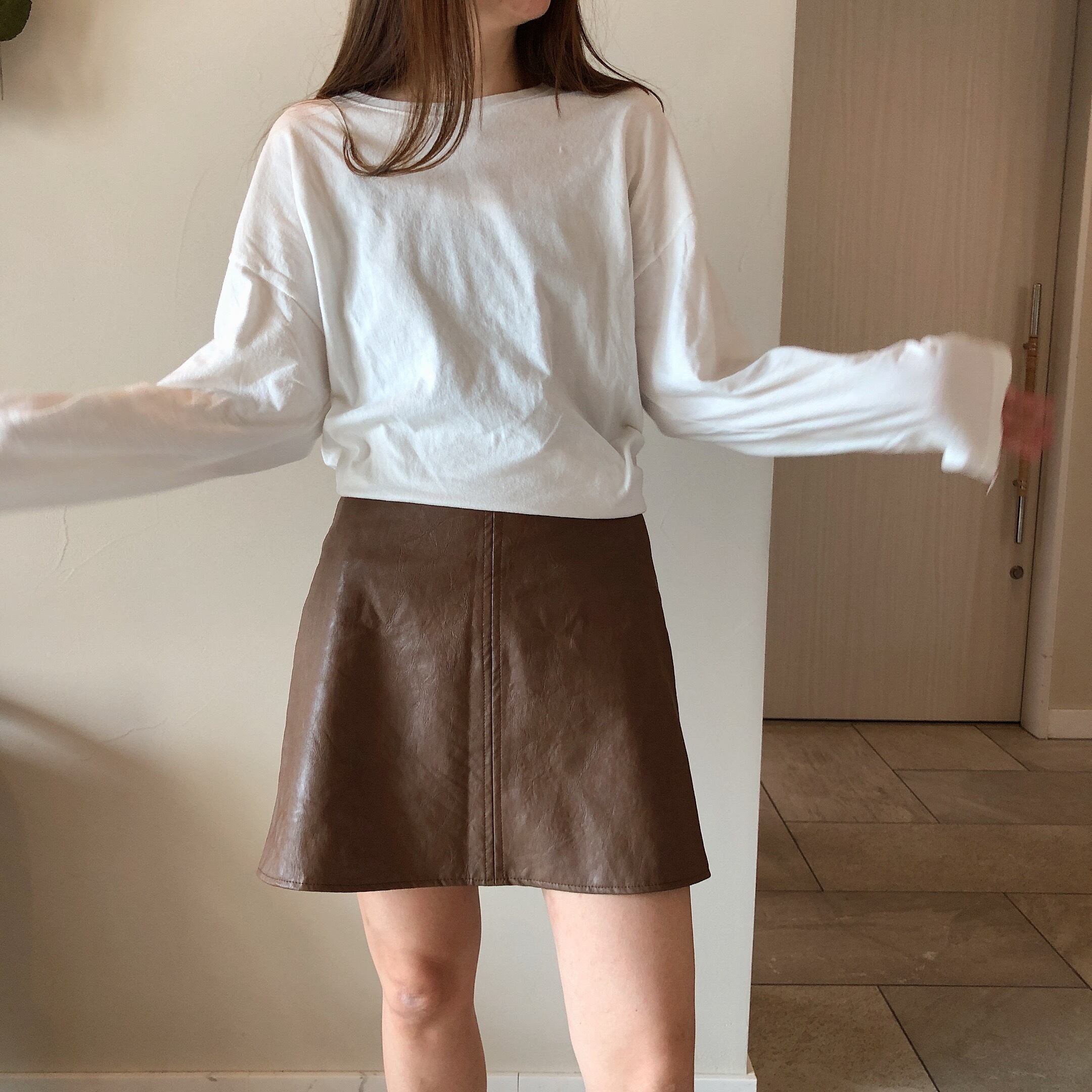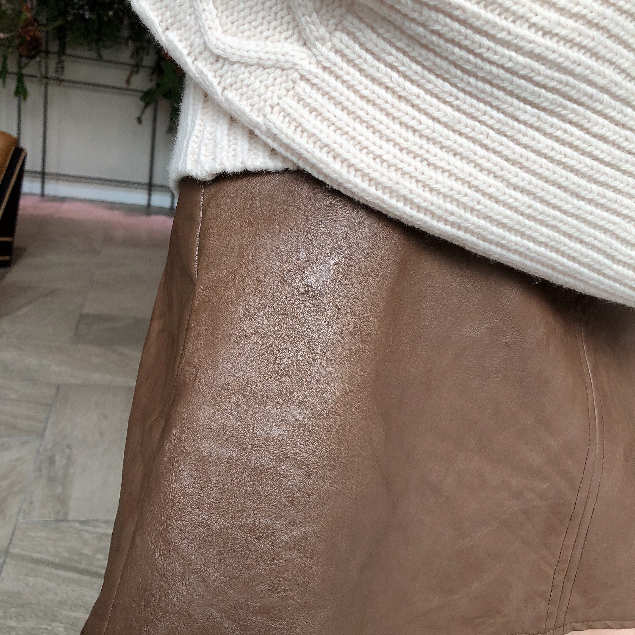 テクスチャーを感じさせるフェイクレザースカート。ブラウンがコーデに柔らかみを持たせてくれて女性らしい雰囲気に。