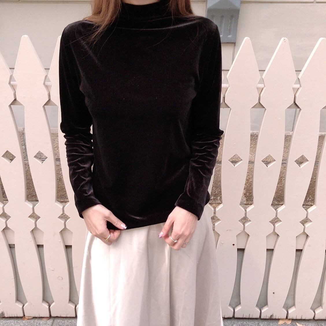 ベロアの微光沢がとてもスタイリッシュなタートルトップス。