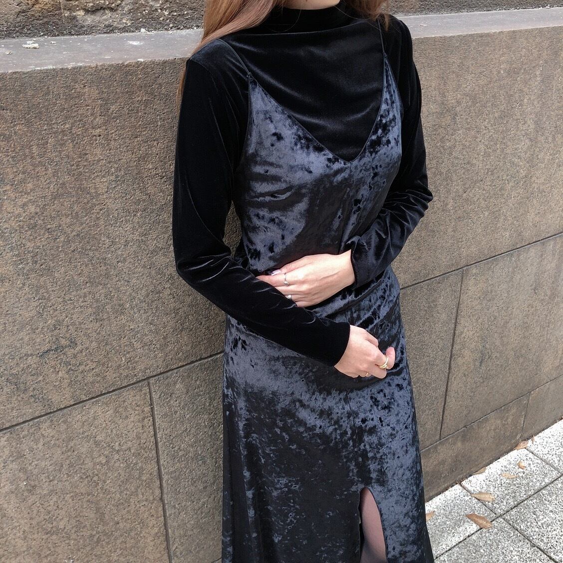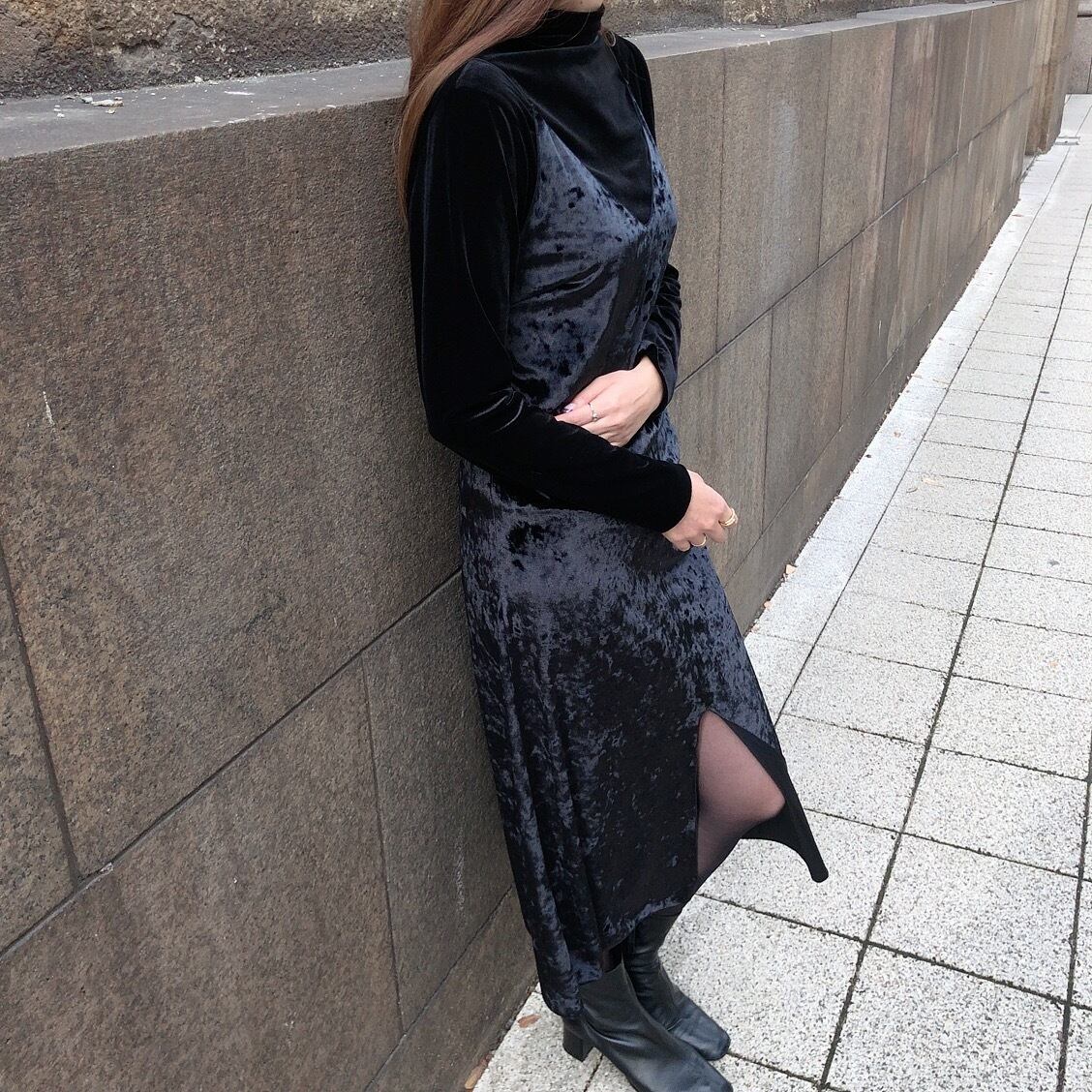 ベロアの微光沢がとてもスタイリッシュなワンピース。