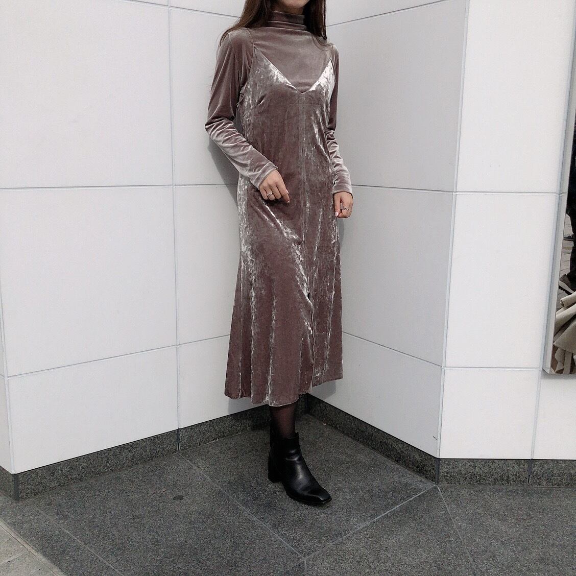 華奢なキャミワンピースとなっているため、重ね着してもすっきりと細身で合わせてもらえます。