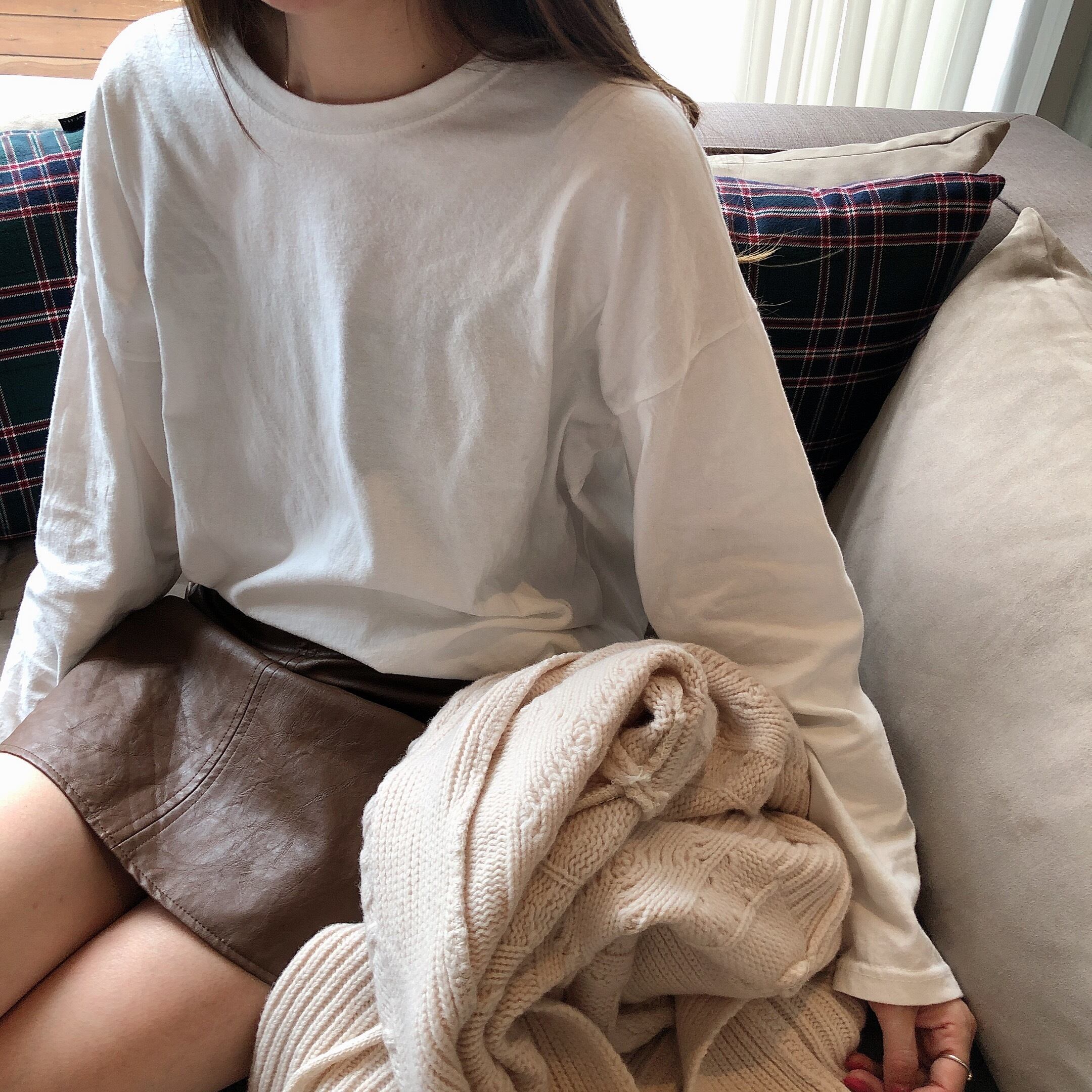 シンプルなラウンドネックトップスはボトムスを選ばず合わせ易いです。