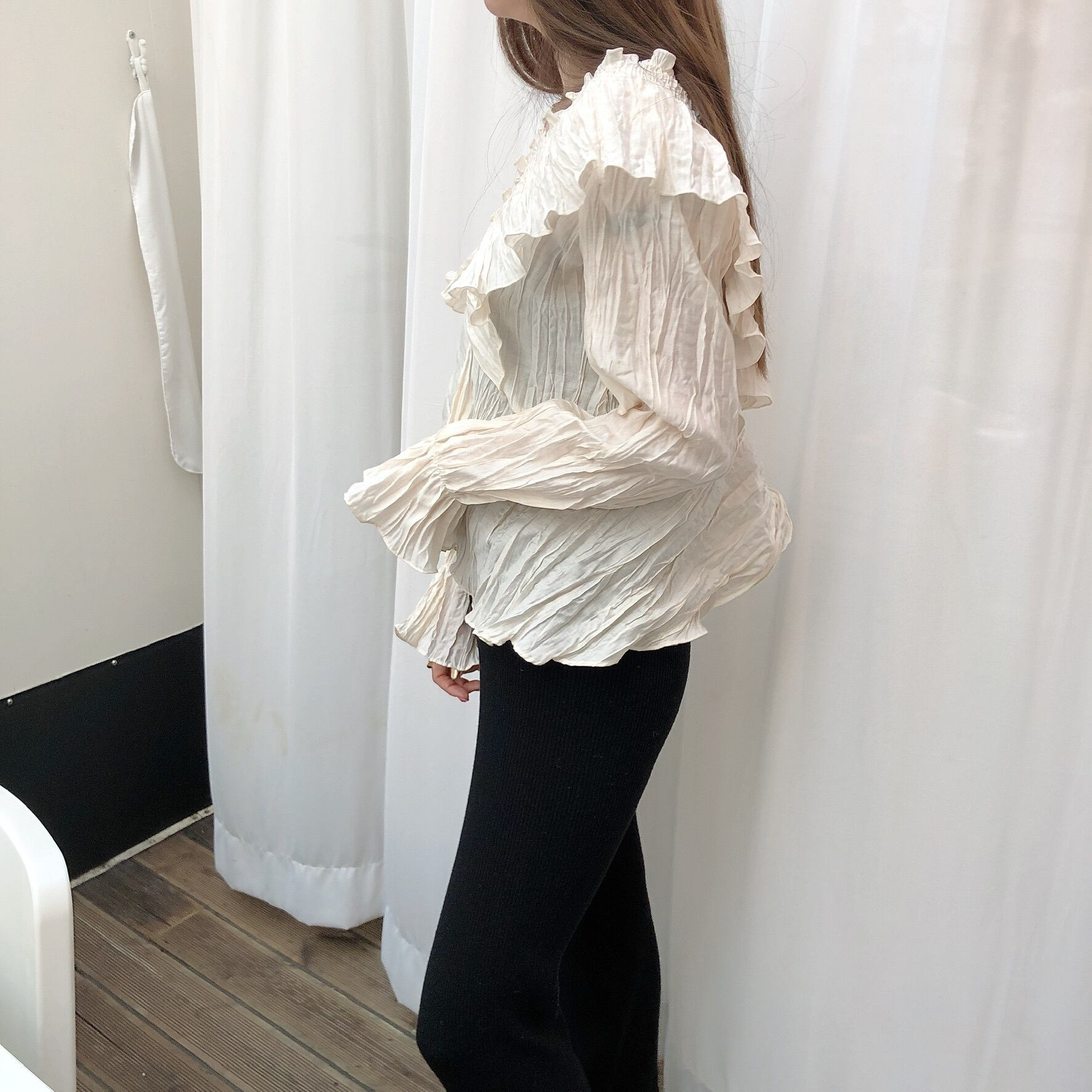 クシュっとしたクリンクル加工と胸元の大きいフリルがとっても可愛い今季イチオシのブラウス。