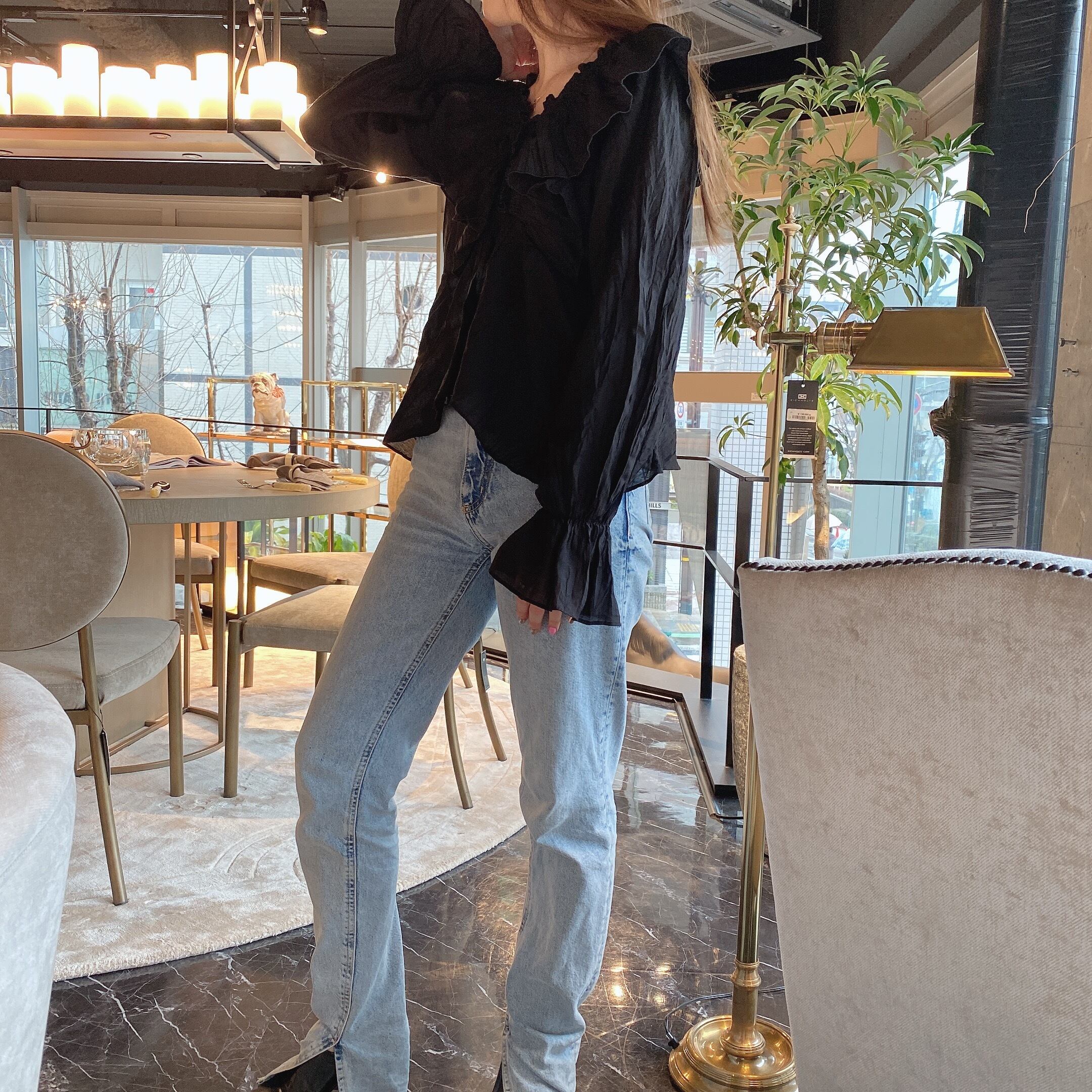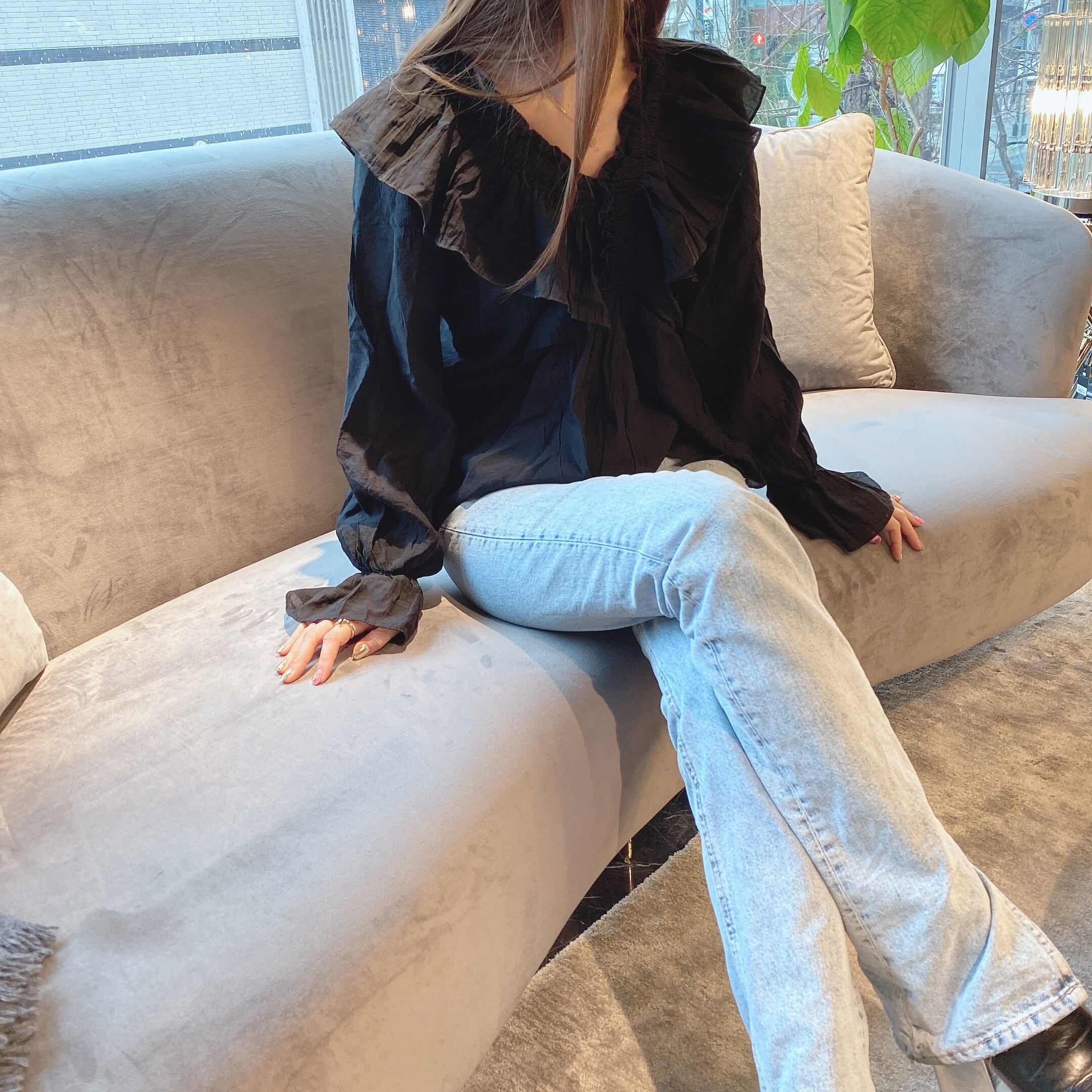 クシュっとしたクリンクル加工と胸元の大きいフリルがとっても可愛い今季イチオシのブラウス。