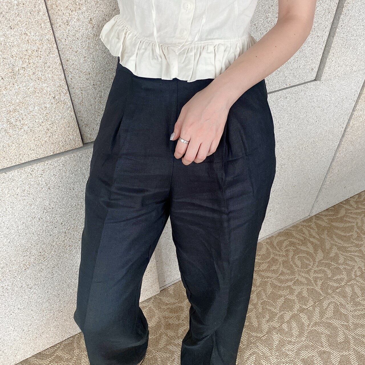 センタープレスで縦のラインを強調し、リネン特有のパリっとした美しいシルエットを実現。