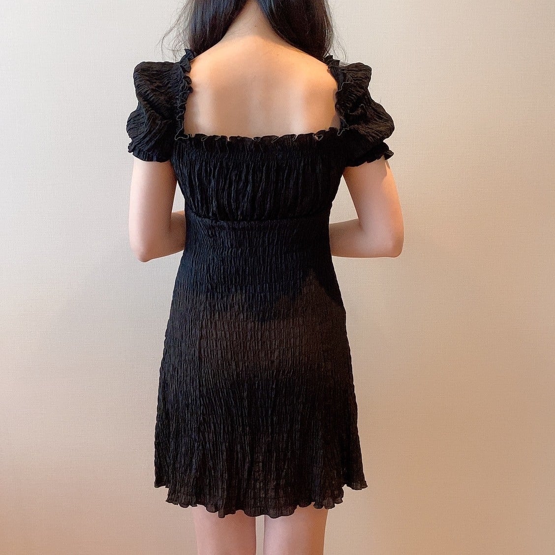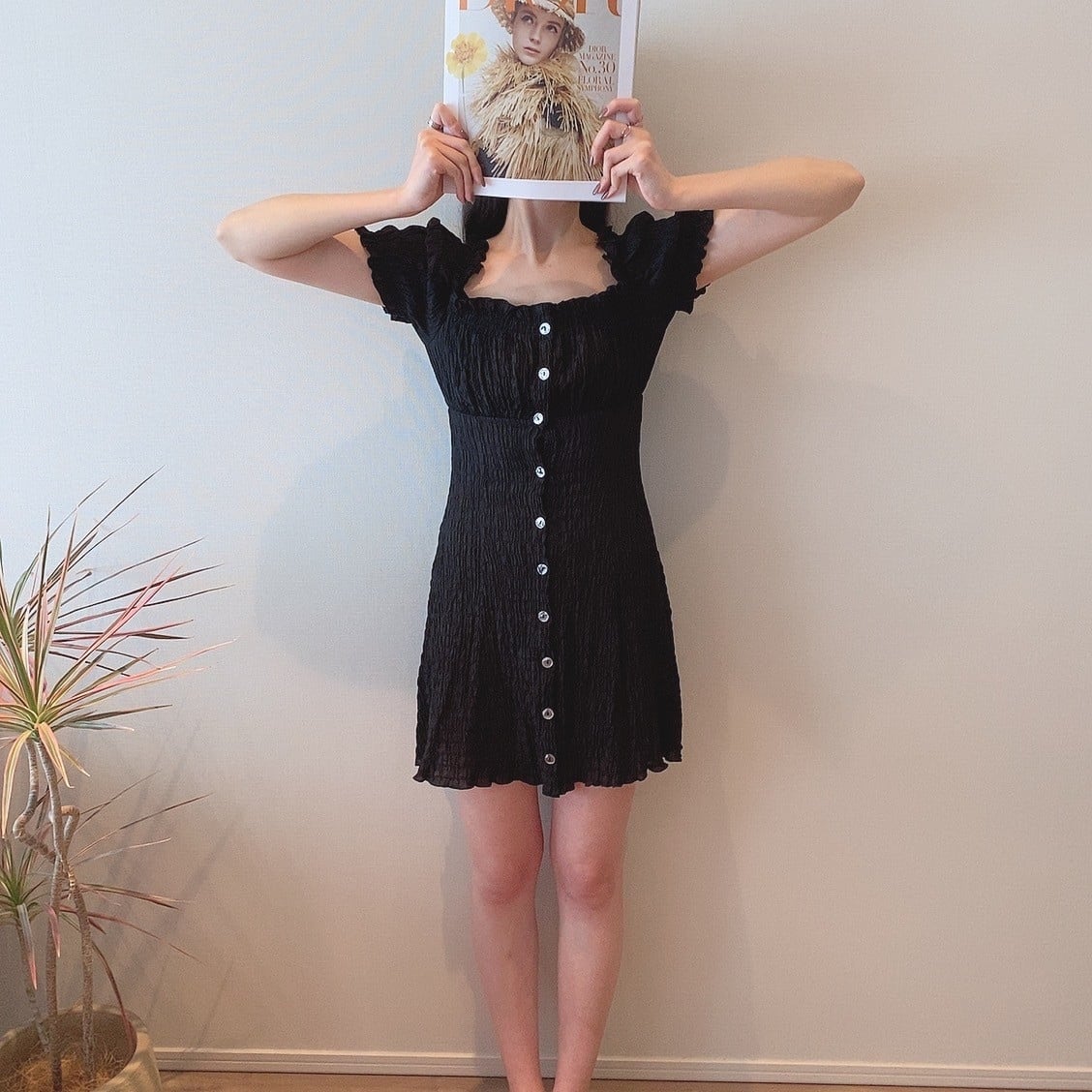 シワ加工がとっても可愛いパフスリーブのミニワンピース。