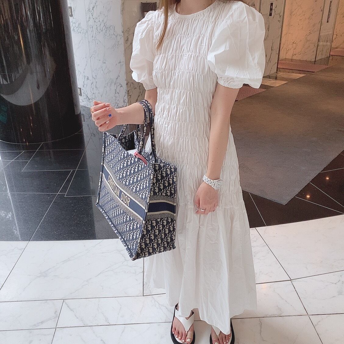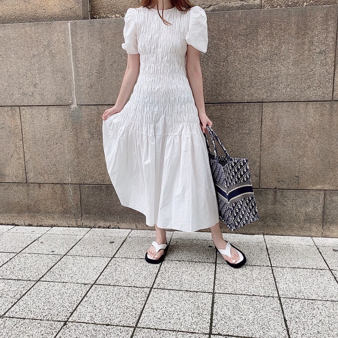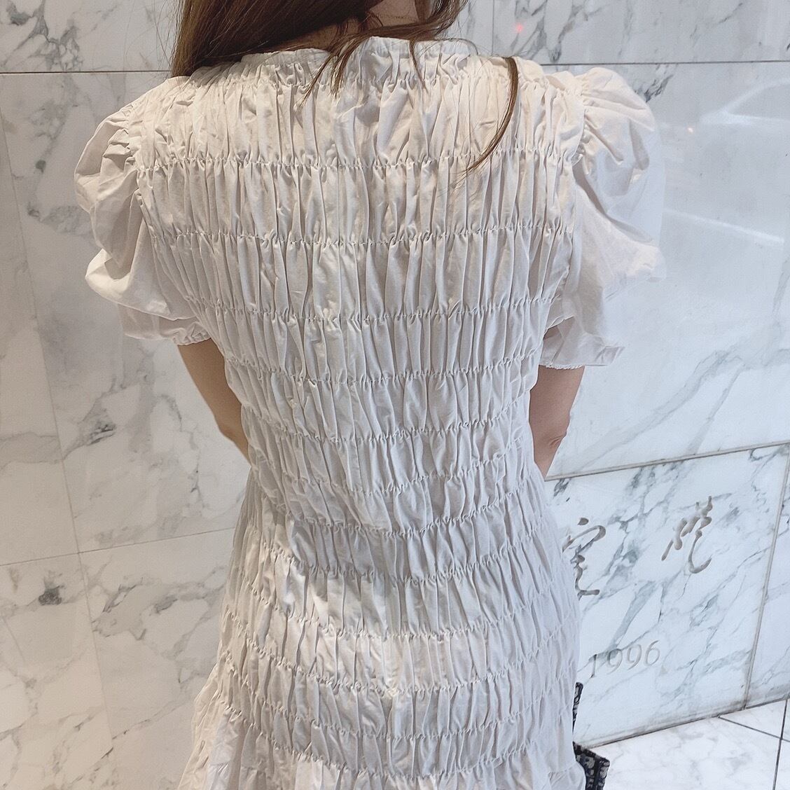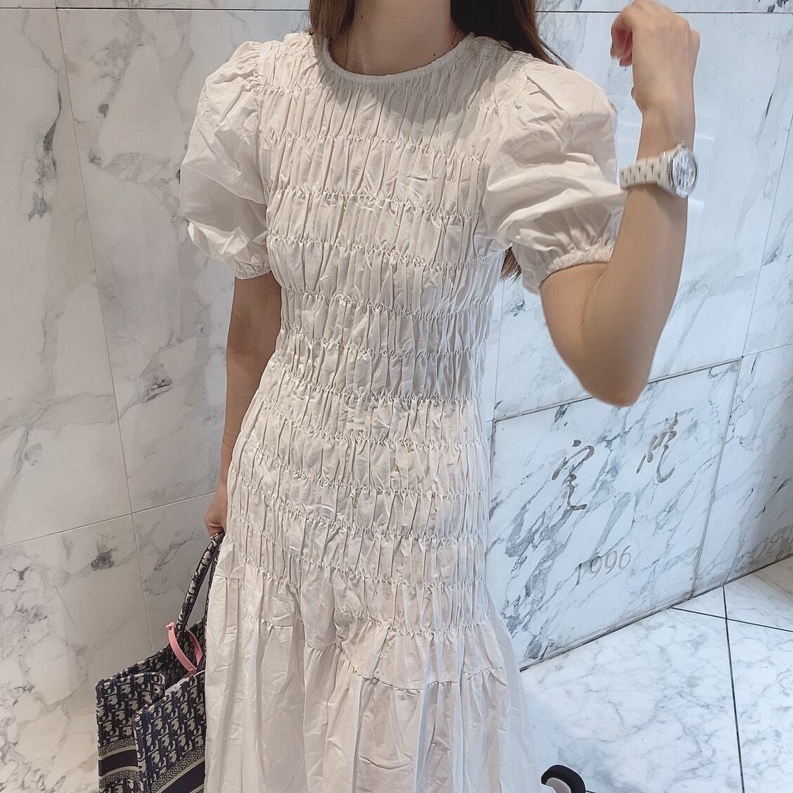 大胆なギャザーとパフスリーブがポイントのワンピース。腰下辺りまでギャザーが入っており、身体のラインを綺麗にカバーしてくれ、ウエストラインを細く見せてくれます。大きめのパフスリーブは女性らしく小顔効果も。
