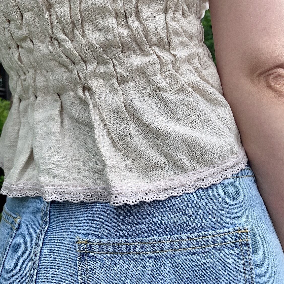 胸元のリボンとシャーリングがポイントのヴィンテージ感のあるブラウス。