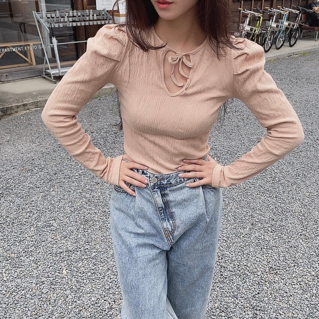 Puff shoulder ribbon tops /Beige(10月上旬頃発送予定)