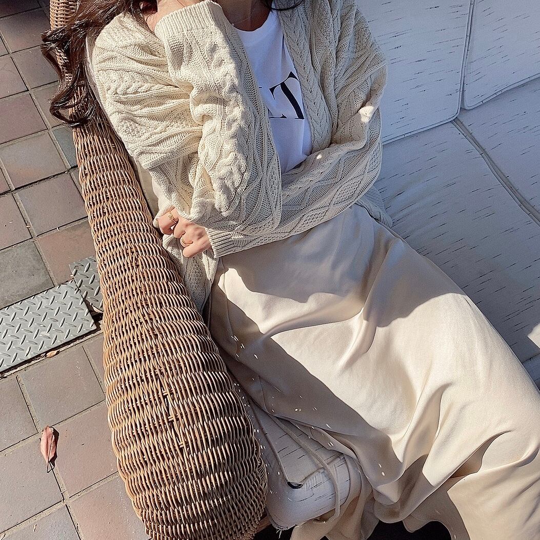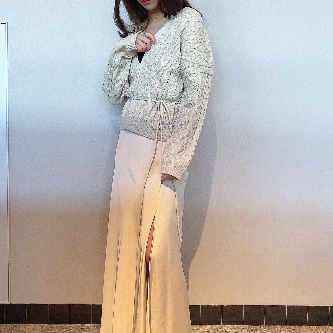 細めの紐でウエストマークできるので、ボリュームのあるニット素材でもスッキリ見えます。