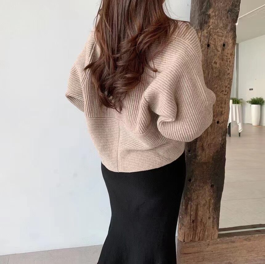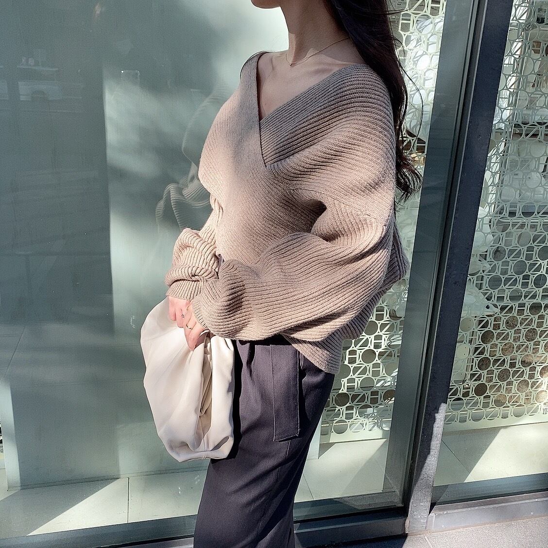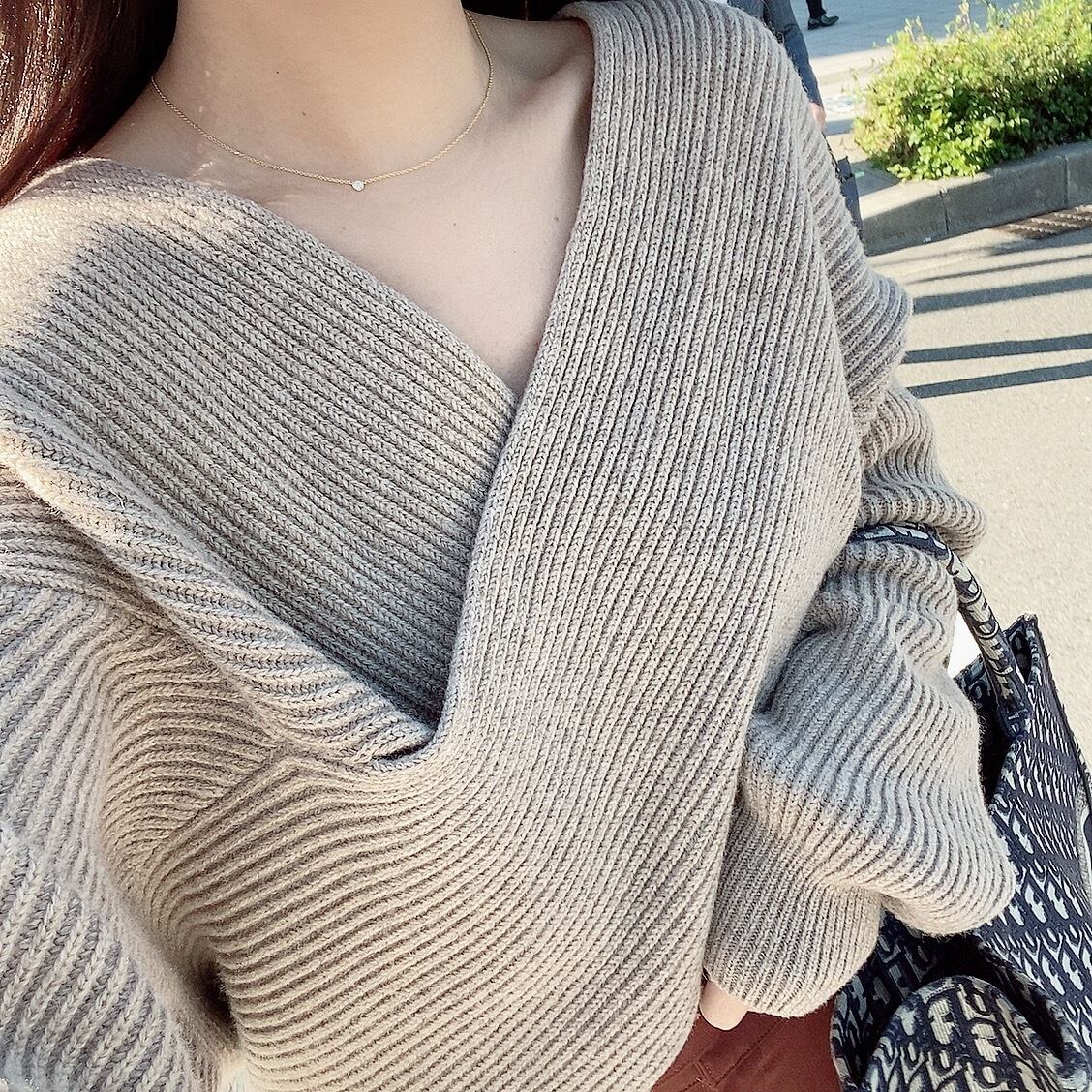 胸元がクロスになっているボリューム感のあるザックリニット。デコルテラインがすっきり見えるデザインなので、女性らしい抜け感のあるスタイリングがしやすいです。