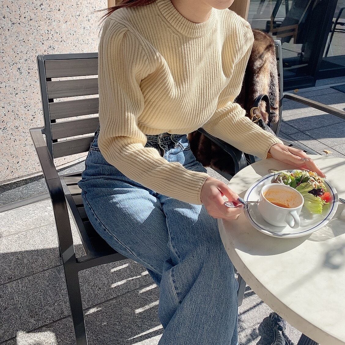 袖にボリュームを出した今季トレンドのパワーショルダーニット。