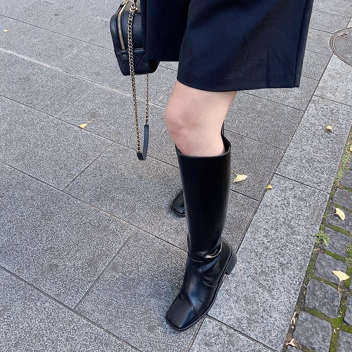 今年トレンドの筒型デザインの膝丈ロングブーツ。