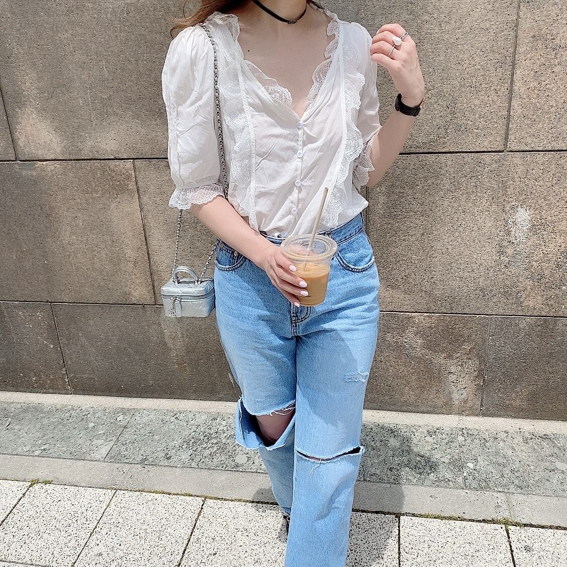 カジュアルなパンツと合わせて、甘さを抑えたコーディネートがおすすめです。
