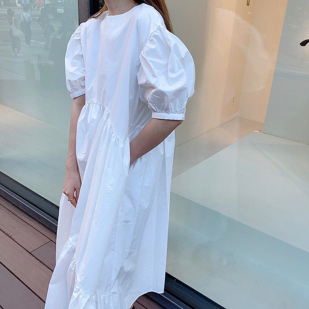 大きめのパフと高めのウエストから裾までフワッと広がるシルエットが可愛いワンピース。
