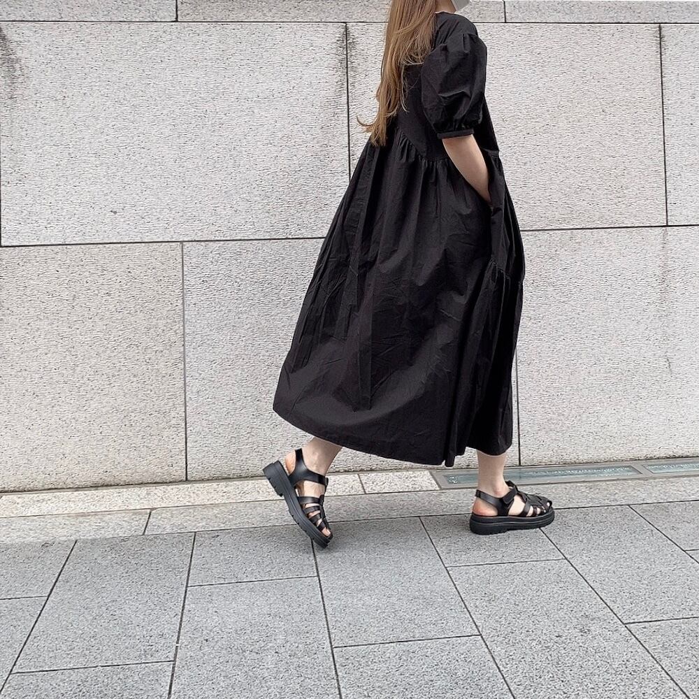 二の腕が隠れるパフスリーブ、肌離れのよいシルエットでリラックスした着心地です。足元はスニーカーやサンダル、ブーツまで合わせられるので、季節の変わり目やシーンによって違った雰囲気を楽しめます。