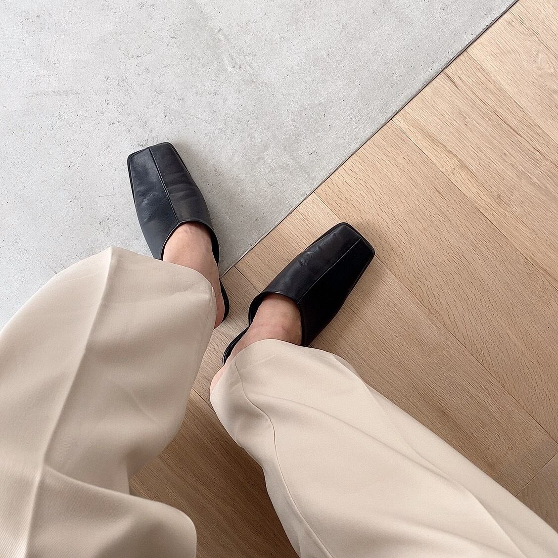スクエアトゥがクールな印象なフラットスリッポン。履くだけで抜け感のあるスタイリングへと導いてくれます。