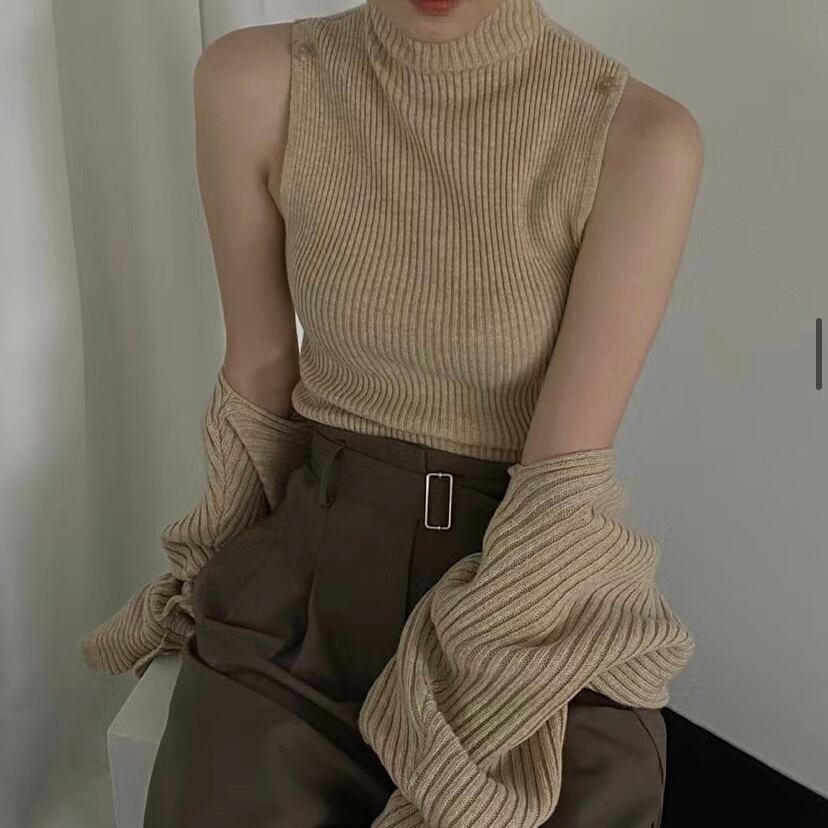 ノースリーブのニットとたっぷりボリューム感のあるボレロがセットになっており、個々での着用も映える一枚。