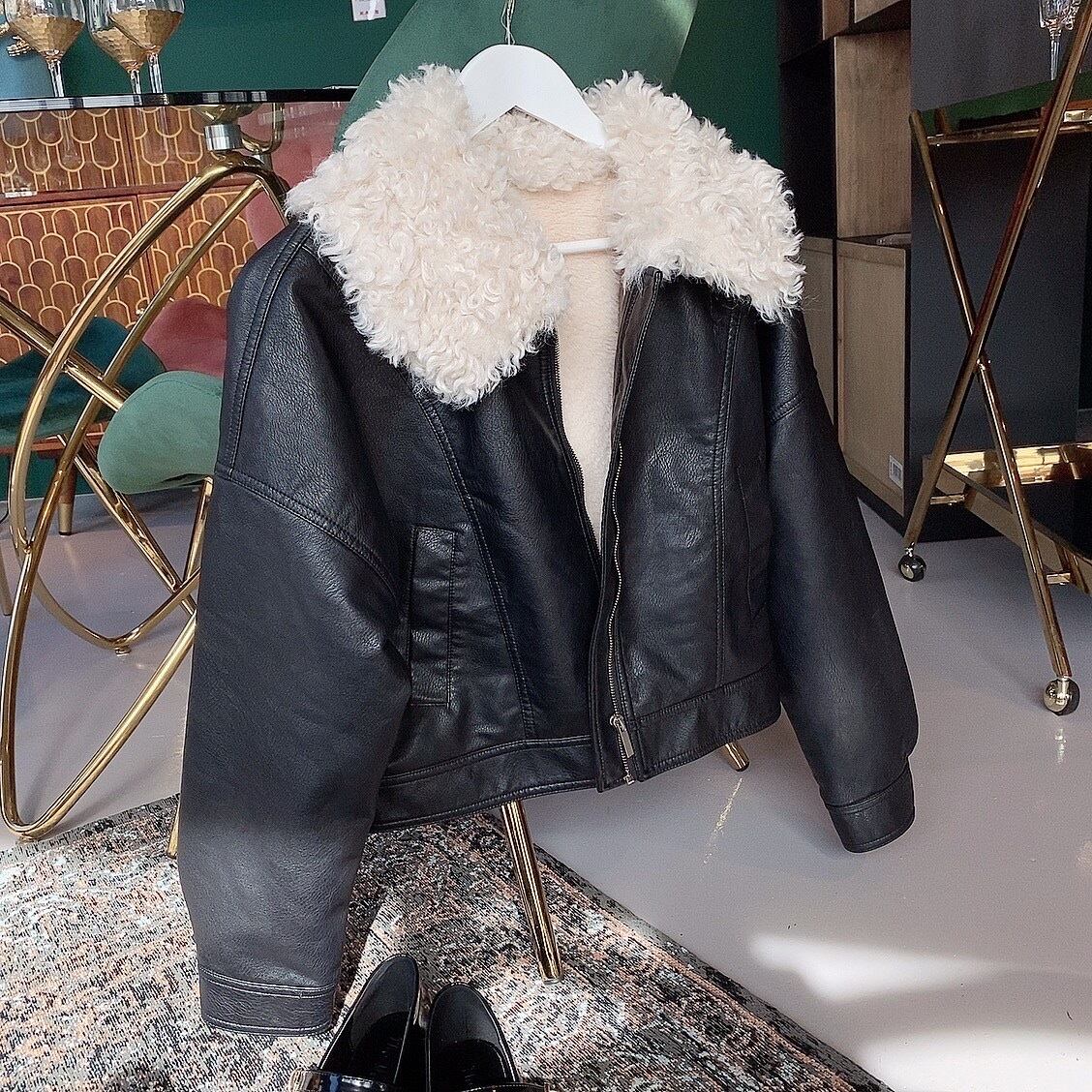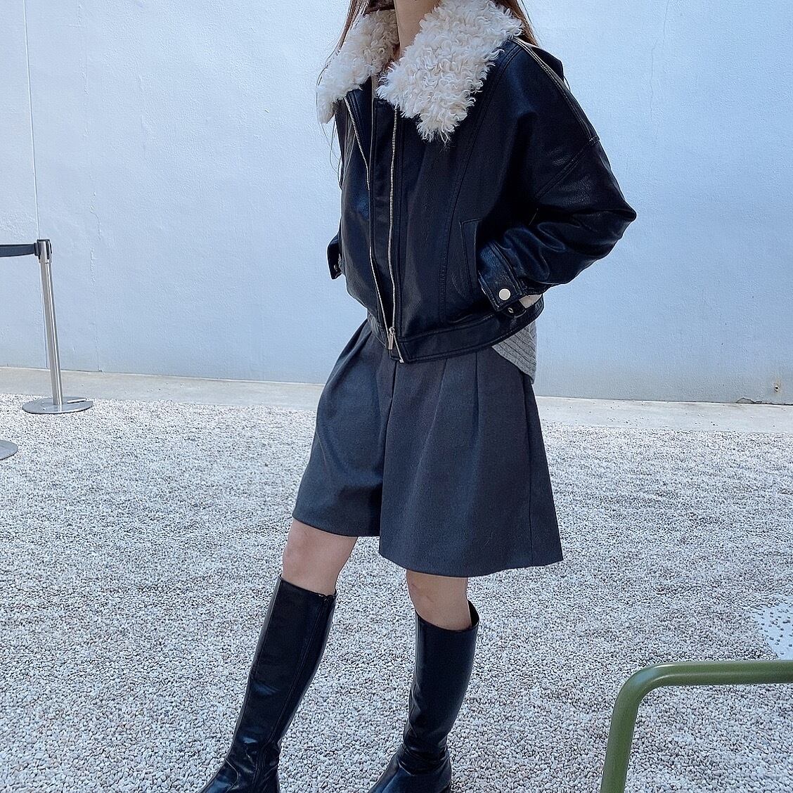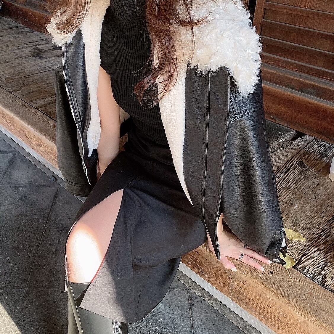 プードルのようなくるくるしたファー襟が愛らしい大人レザージャケット。