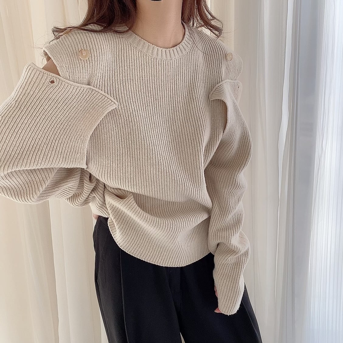 袖にボタンをつけ、取り外すことで袖を落として着ることもできる2wayニットトップス。