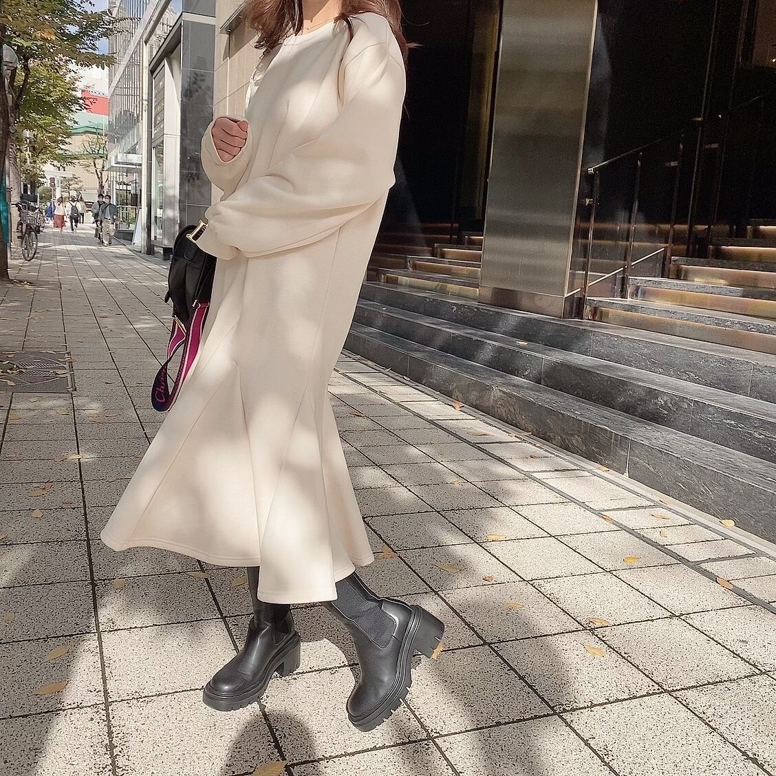 スカート部分はドレープの揺れ感たっぷりなマーメイドラインでカジュアルながらも女性らしさを演出してくれます。