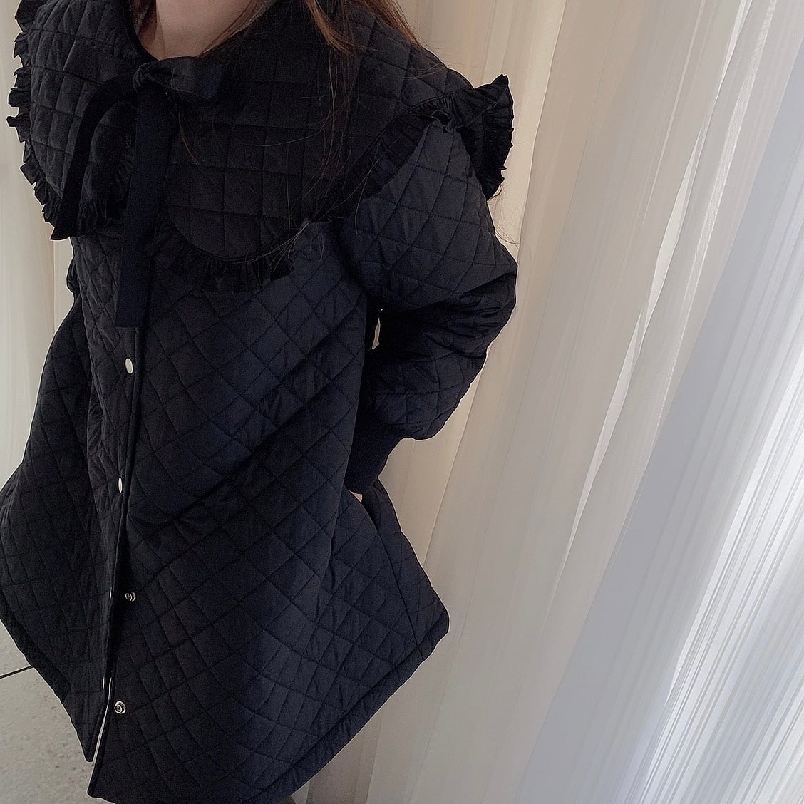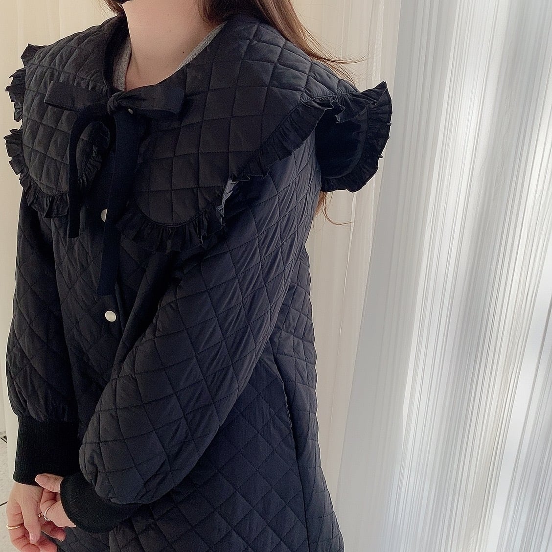 顔まわりを華やかに見せてくれる大きめのフリル襟が今季トレンドのキルティングコート。